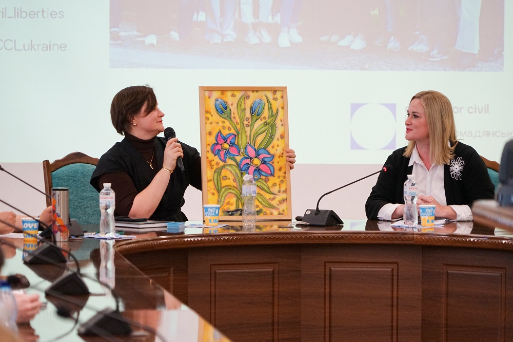 Учасники обговорювали тему «Свобода під обстрілами: права людини під час війни». Пані Саша розповіла про роботу Центру громадянських свобод, трансформацію правозахисних практик, важливість знання своїх прав, а також про відповідальність кожного громадянина в умовах війни.
