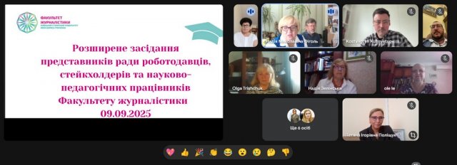 9 вересня 2025 року відбулося розширене засідання стейкхолдерів: Ради роботодавців, науково-педагогічних працівників Факультету журналістики та представників інших ЗВО, під час якої відбулося обговорення змін до освітньо-наукової програми С7 «Журналістика».