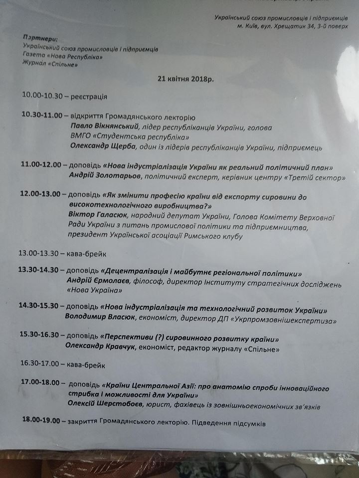 У суботу, 21 квітня молодіжна громадська організація «Студентська республіка» за підтримки Українського союзу промисловців і підприємців та газети "Нова Республіка" провели громадянський лекторій на тему "Інноваційний прорив і "нова індустріалізація" як складові модернізації України".