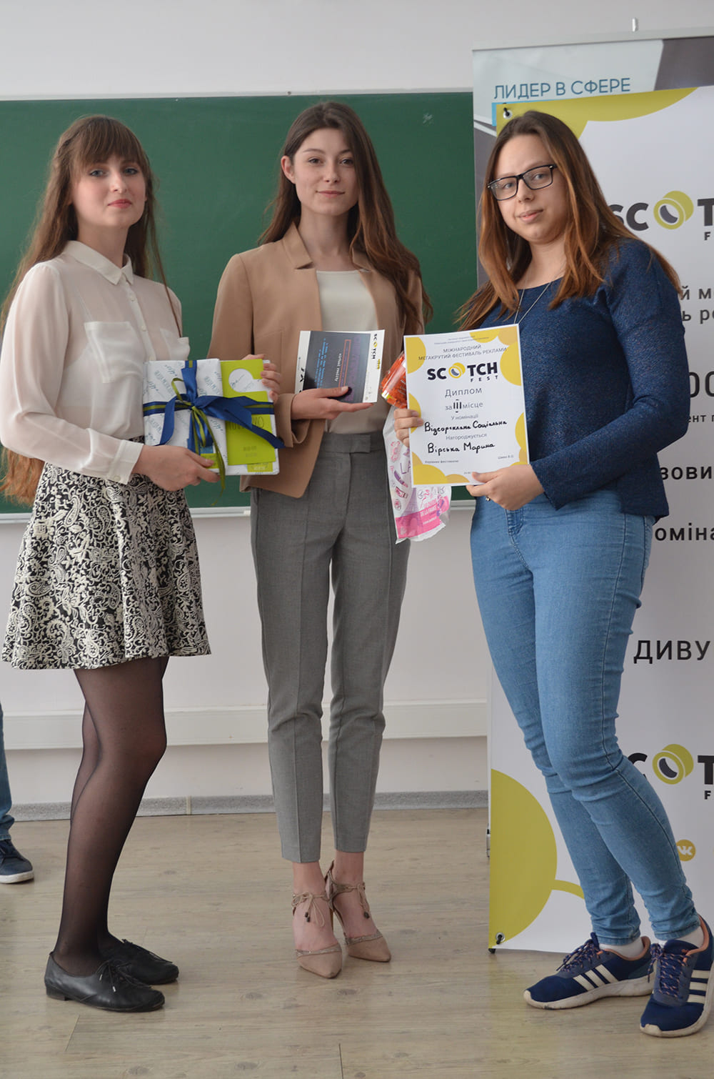 У середу, 23 травня 2018 року в Інституті журналістики відбувся Міжнародний фестиваль реклами “Scotch Fest”. Студенти кафедри реклами та зв’язків з громадськістю Євгенія Травіна, Карина Борзаківська та Вікторія Коваль на чолі з керівником фестивалю – старшим викладачем кафедри Віктором Шияном вчетверте організували святковий настрій для учасників та гостей фестивалю.