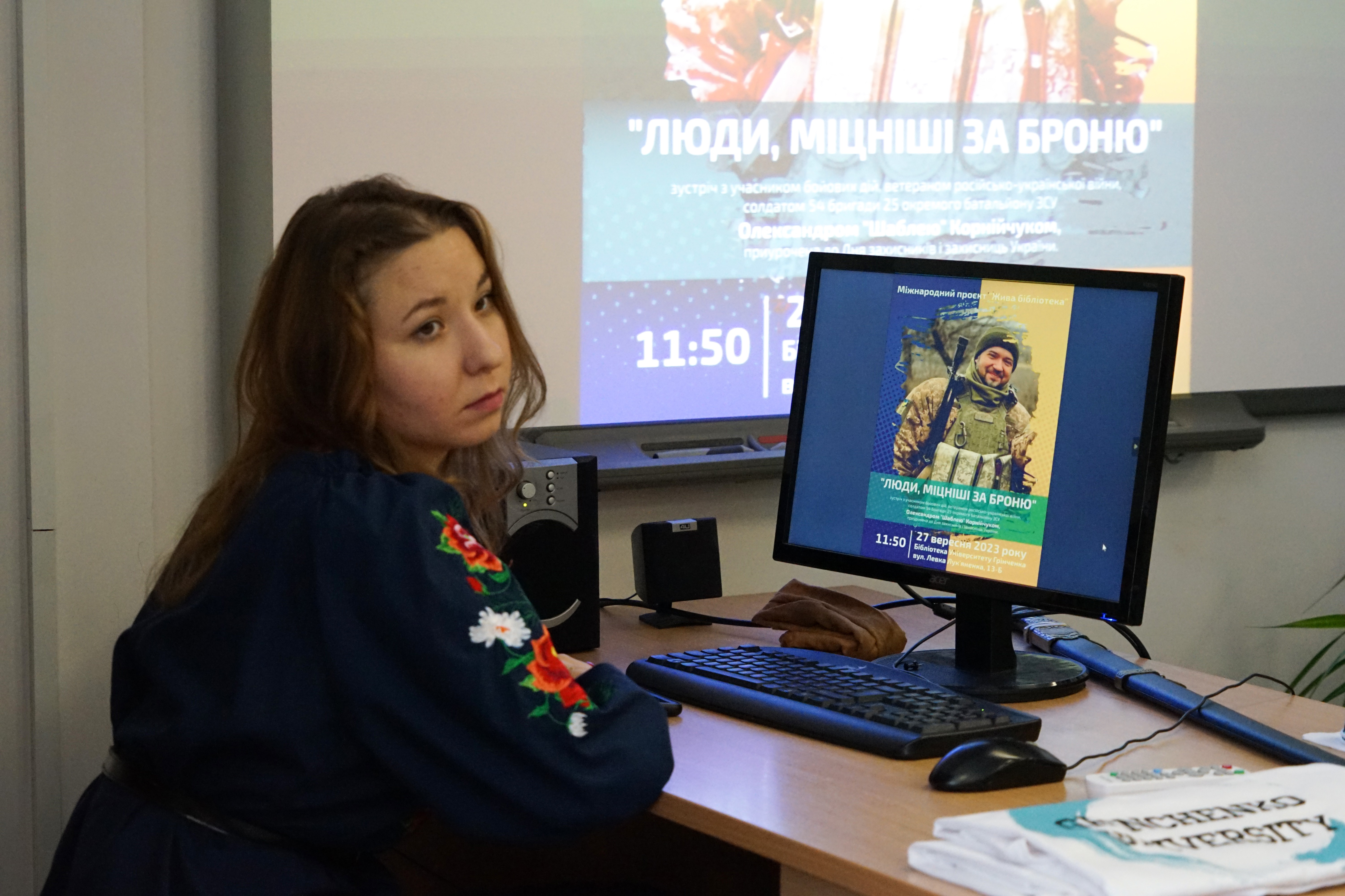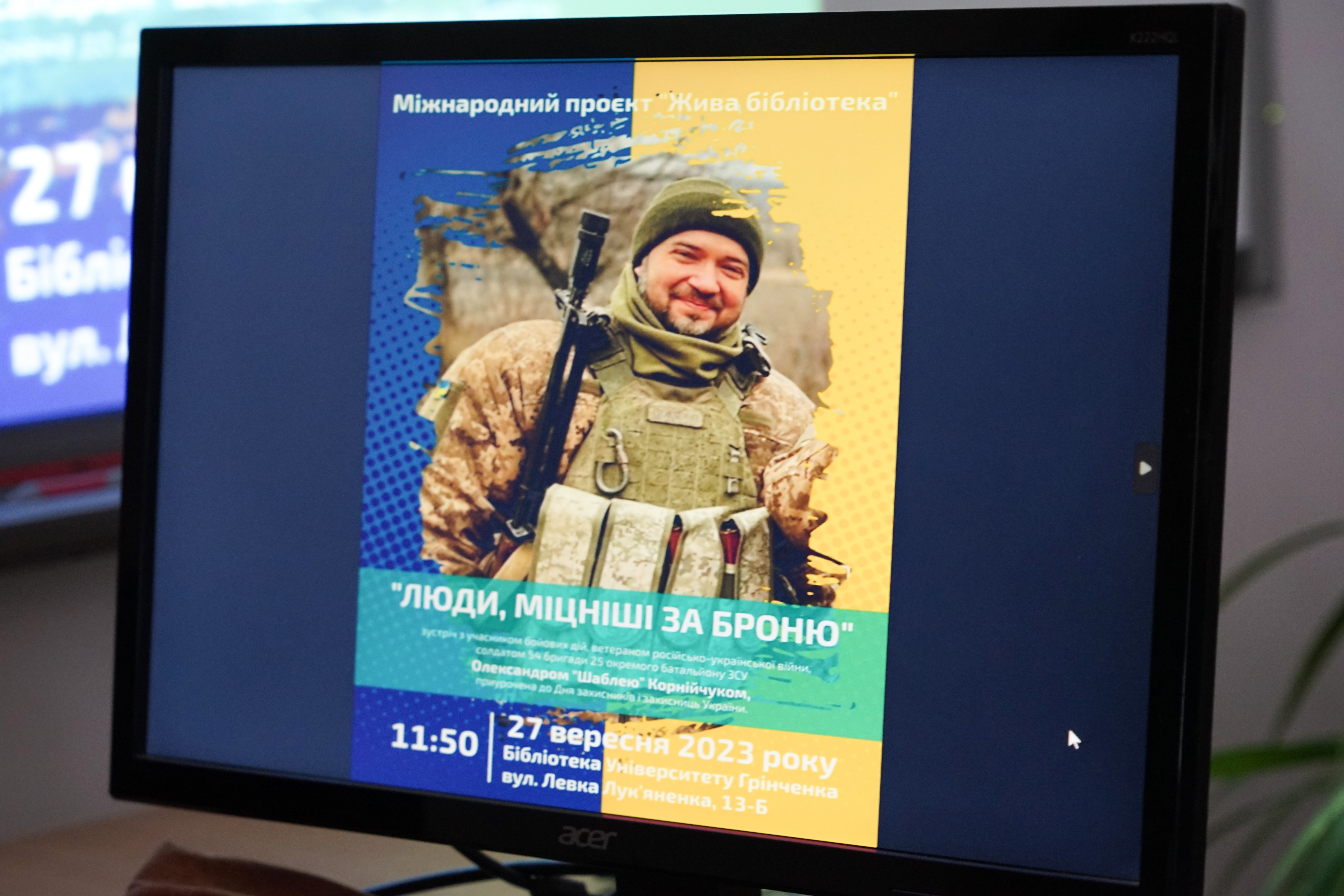 У переддень Дня захисників і захисниць України, 27 вересня 2023 року, на зустріч зі студентами-журналістами до Київського університету імені Бориса Грінченка завітав ветеран російсько-української війни Олександр Корнійчук з позивним Шабля. Зустріч відбулася в межах міжнародного проєкту «Жива бібліотека», коли герої приходять на зустрічі з аудиторією, щоб розповісти свою історію життя. Модератором виступила директор бібліотеки Університету Грінченка Тетяна Опришко.