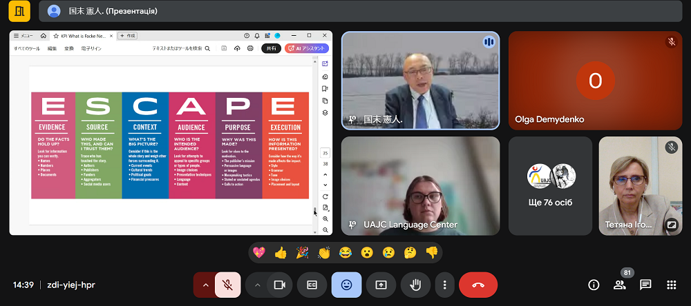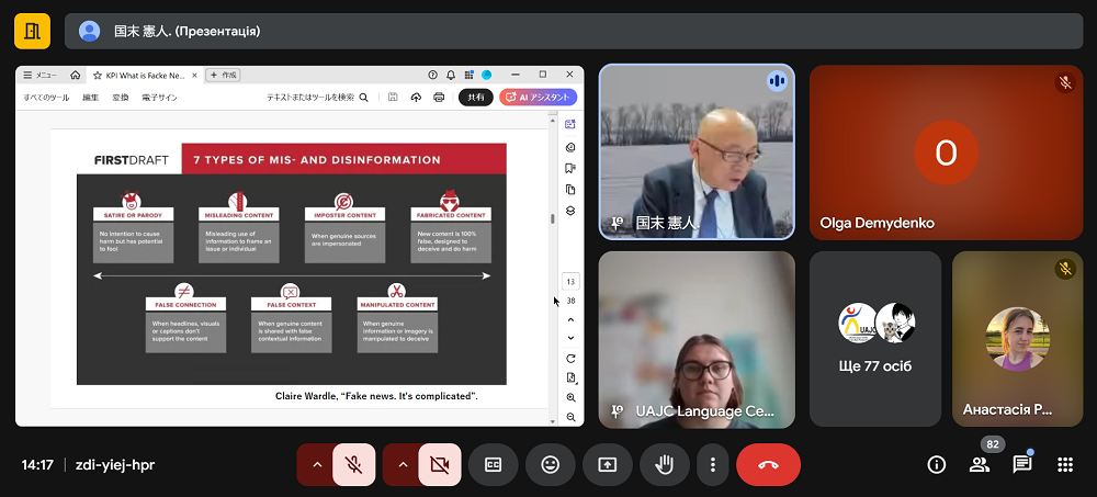 24 квітня 2025 року відбулась гостьова лекція Норіто Кунісуе, лектора факультету лінгвістики університету КПІ ім. Ігоря Сікорського, професора Дослідницького центру передових наук і технологій Токійського університету, який виступив з темою “Фейк ньюз”.