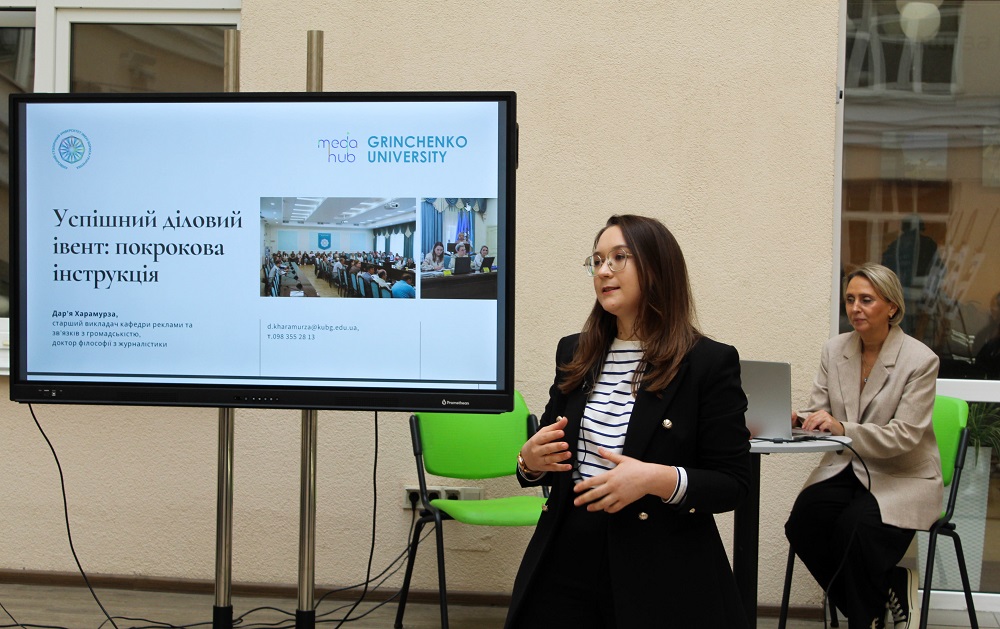 Після перерви, про організацію та особливості ділових подій говорила Дар’я Харамурза – доктор філософії з журналістики, старший викладач кафедри реклами та зв’язків з громадськістю, організатор міжнародних конференцій та ділових івентів, медіатренер в межах лекції «Успішний діловий івент: покрокова інструкція». Тут увагу учасників звертали на особливості задуму, організації й проведення подій як офлайн/онлайн так і у змішаному форматі з урахуванням всіх перепон, які можуть виникнути. Цінним був досвід Факультету журналістики: пані Дар’я розповіла як про успішні події, так і труднощі, що було дуже важливо для аналізу діяльності та покращення реалізації майбутніх івентів