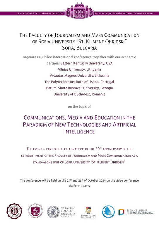 24-25 жовтня 2024 року на платформі відеоконференцій Microsoft Teams відбулася ювілейна Міжнародна наукова конференція "Communications, Media and Education in the Paradigm of New Technologies and Artificial Intelligence" організована Факультетом журналістики та масової комунікації Софійського університету «Св. Климент Охридський». Партнерами конференції виступили університети Литви, Румунії, Грузії, Португалії та США. Усього в конференції взяли участь понад 90 представників різних країн. Від Факультету журналістики Київського столичного університету імені Бориса Грінченка виступили Тетяна Поліщук, старший викладач кафедри реклами та зв'язків з громадськістю та Олександра Гондюл, викладач кафедри міжнародної журналістики. У своїй доповіді "Media education for adults at the Media Hub Grinchenko University" вони познайомили професійну спільноту з досвідом медіаосвіти для дорослих, який реалізує Факультет журналістики. У доповіді представили успішно реалізовані проєкти на базі Медіахабу Університету Грінченка: