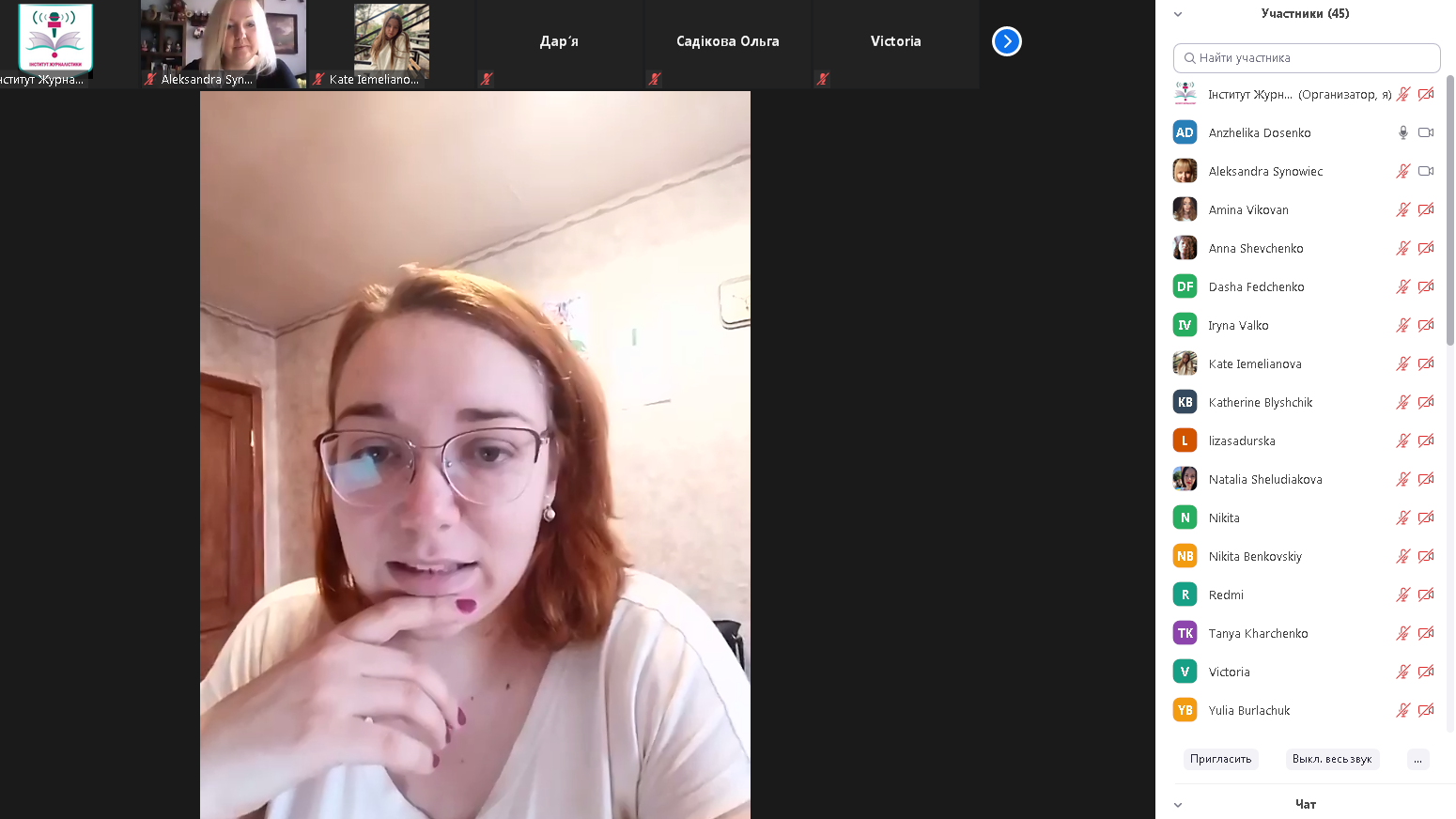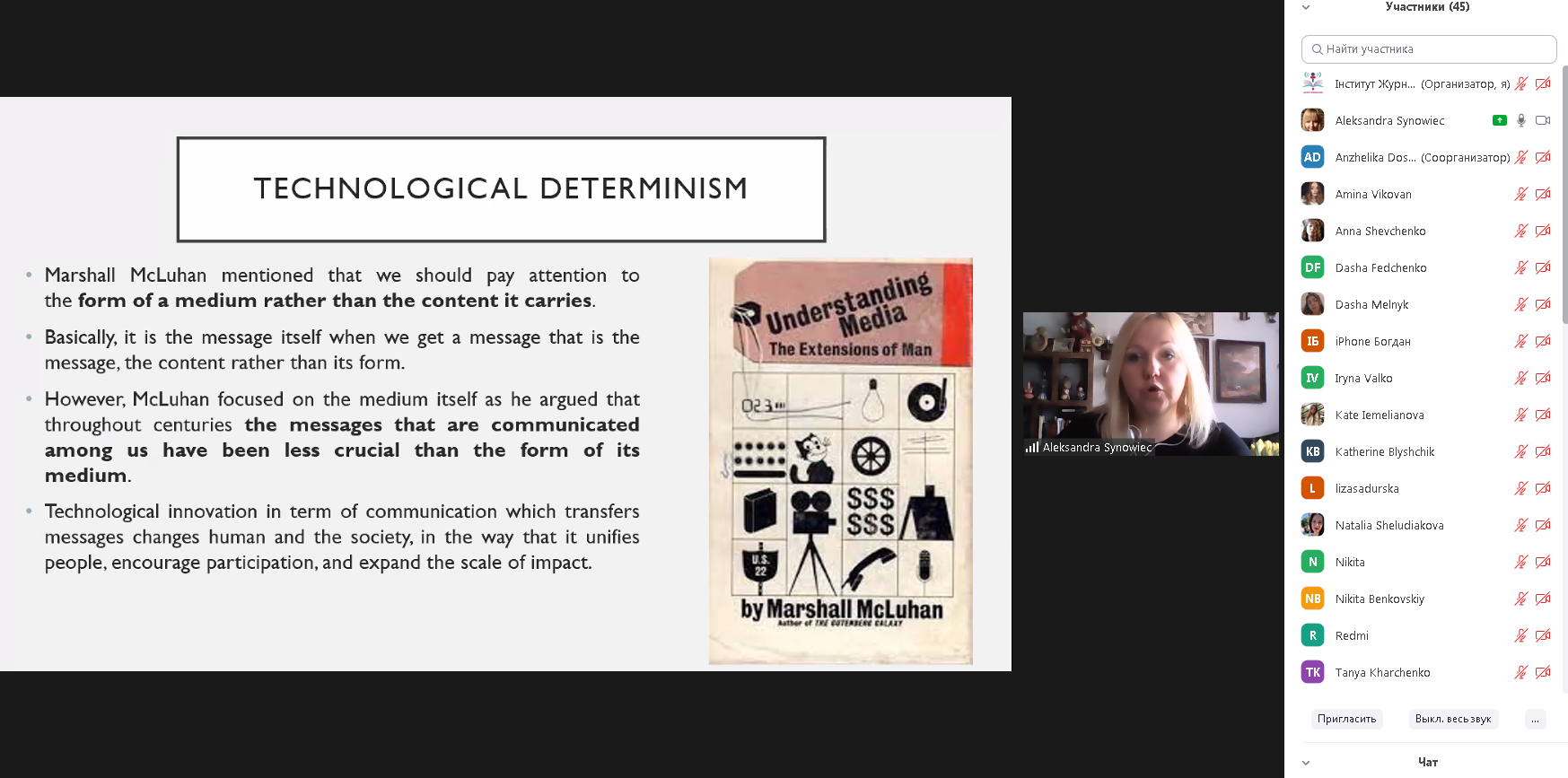 18 березня 2021 року студенти 5-го курсу спеціальності 061 «Журналістика» освітньої програми «Контент-продюсування цифрових медіапроєктів» мали нагоду у форматі відеоконференції на платформі «Zoom» прослухати лекцію та подискутувати з професоркою Силезького університету Олександриою Синовець на тему «Why do social scientist need Facebook?». Лекція та спілкування проходили англійською мовою.