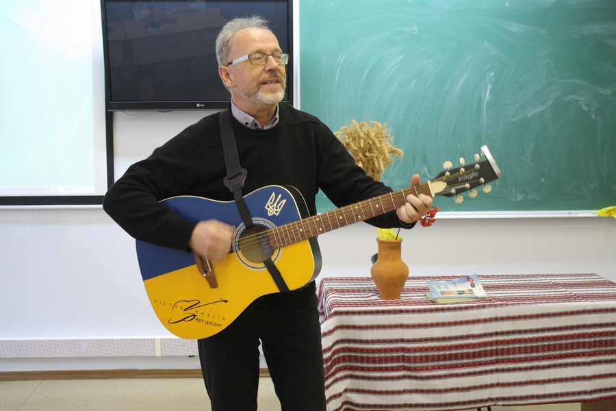 З великим інтересом студенти слухали Сергія Лазо. Автор виконав декілька власних пісень, читав свої вірші.