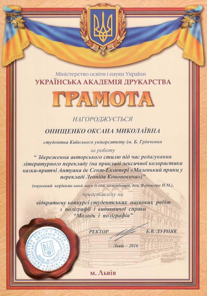 Роботи «Сучасна політична література: особливості видавничої підготовки» Білас Христини (керівник Школик І.В.), «Збереження авторського стилю під час редагування літературного перекладу (на прикладі лексичної колористики казки-притчі Антуана де Сент-Екзюпері «Маленький принц у перекладі Леоніда Кононовича»)» Онищенко Оксани (керівник Вернигора Н.М.), «Самвидав як альтернатива традиційному книговиданню: ризики і переваги» Бугери Юлії (керівник Єжижанська Т.С.), «Актуальні проблеми розвитку книговидавничої справи та їх законодавче вирішення» Горбаченко Олени (керівник Школик І.В.) нагороджені почесними грамотами за участь.