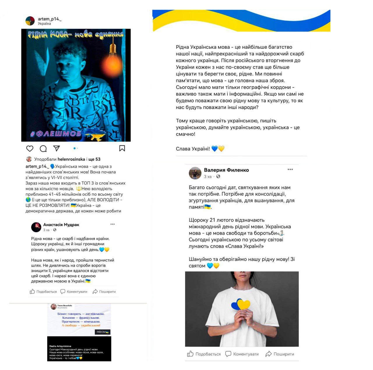21 лютого 2023 року кафедра міжнародної журналістики КУБГ запустила флешмоб «Рідна мова – мова єднання», присвячений Дню рідної мови, та запропонувала бажаючим доєднатися до нього, опублікувавши свої роздуми. Ті, хто відгукнулись, опублікували тексти присвячені історії розвитку мови, умовам її існування, поділилися власними почуттями та емоціями, що сьогодні є надзвичайно важливим. Приємно бачити, що молодь не стоїть осторонь, а проявляє свідоме бажання говорити рідною солов’їною мовою, усвідомлює її значення для розвитку країни, культури та здобуття Перемоги!