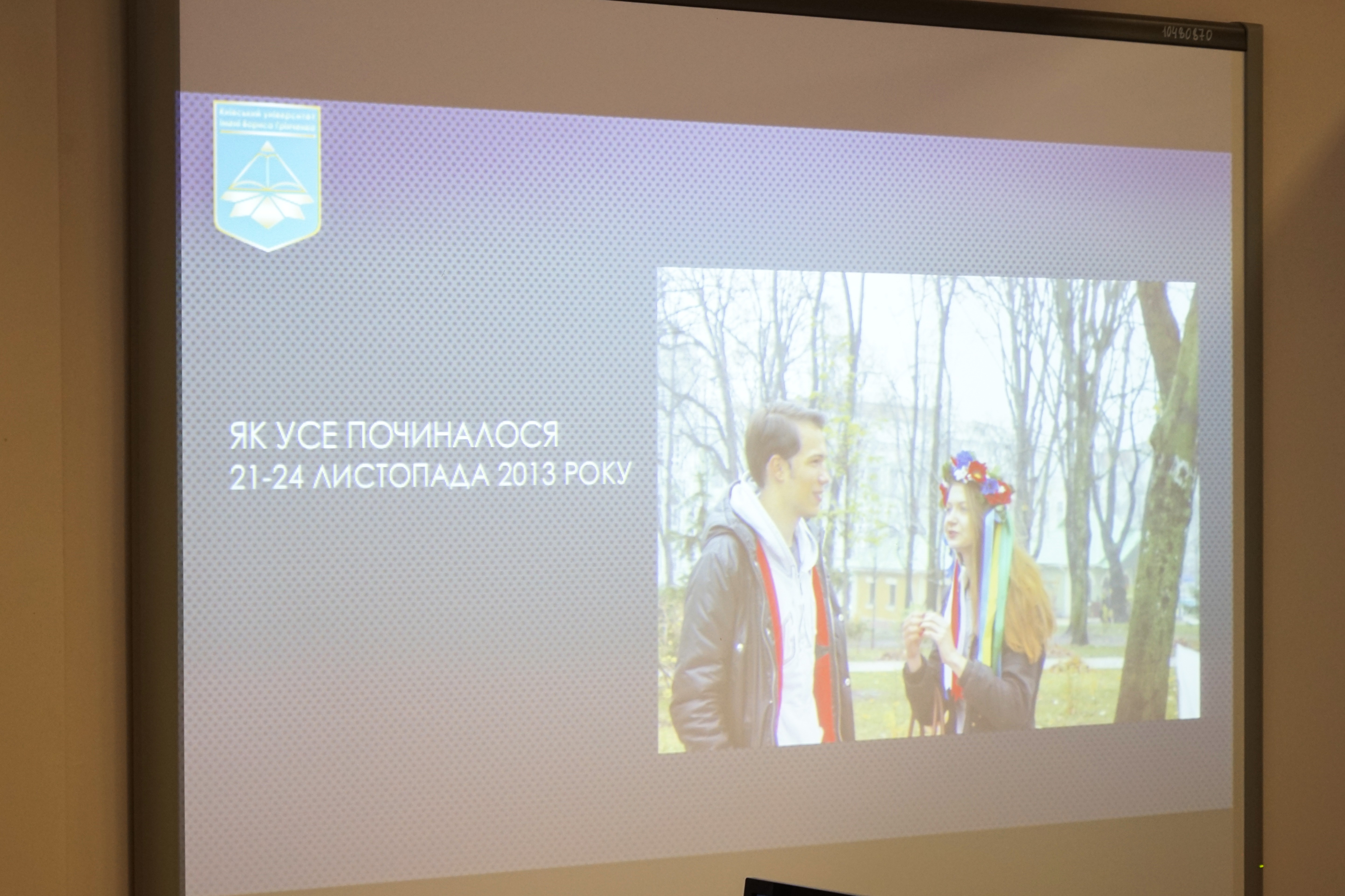 У Бібліотеці Університету відзначили 10-річницю Майдану по-особливому. Герої згадували особисту участь. Пані Юлія розповіла про найдраматичніші моменти протистояння. Модератор заходу заступник декана Факультету журналістики Тетяна Поліщук підготувала і свої світлини, розповіла про історичний масштаб події. Завідувачка Навчально-виробничої майстерні «АстудіЯ» Мар’яна Ангелова представила створений десять років тому документальний фільм «Дух Майдану», в якому студенти зафіксували свої почуття з яких складався Майдан. А нинішні грінченківці щиро поділилися власними дитячими спогадами про ті події: хтось ходив на віче щонеділі з бабусею, хтось спостерігав, як батьки збирають для Майдану речі та передають до Києва, а хтось згадував, як з острахом сприймали ці події у Краматорську.
