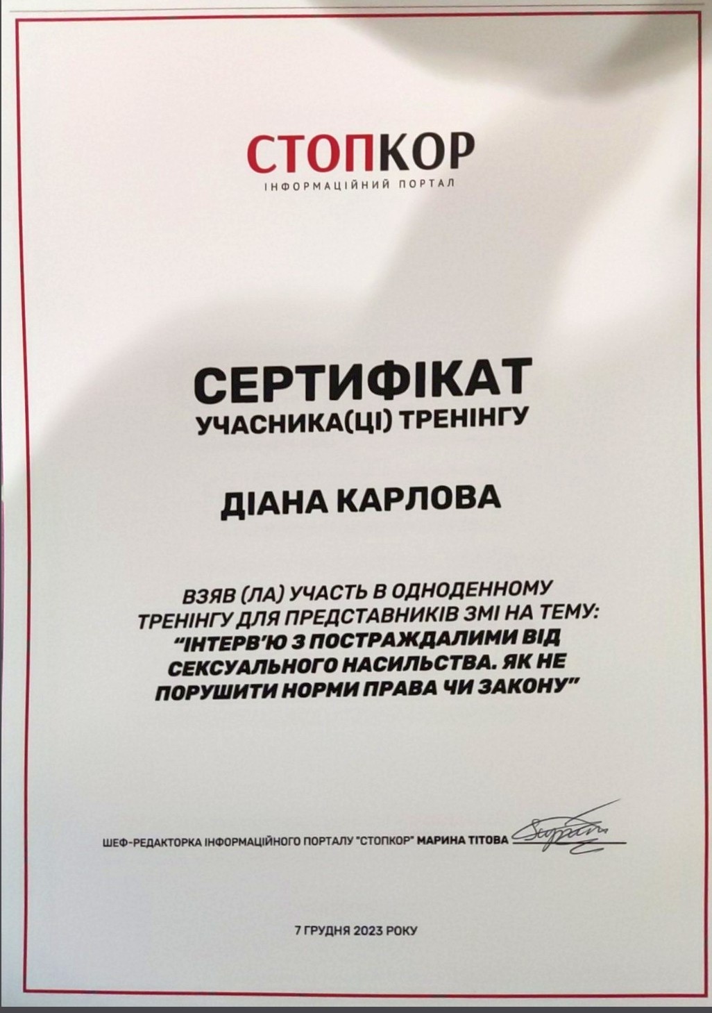 7 грудня 2023 року здобувачка II курсу освітньої програми «Міжнародна журналістика» Діана Карлова взяла участь у тренінгу для журналістів «Інтерв’ю з постраждалими від сексуального насильства. Як не порушити норми права чи закону», який відбувся у пресцентрі «СтопКор».