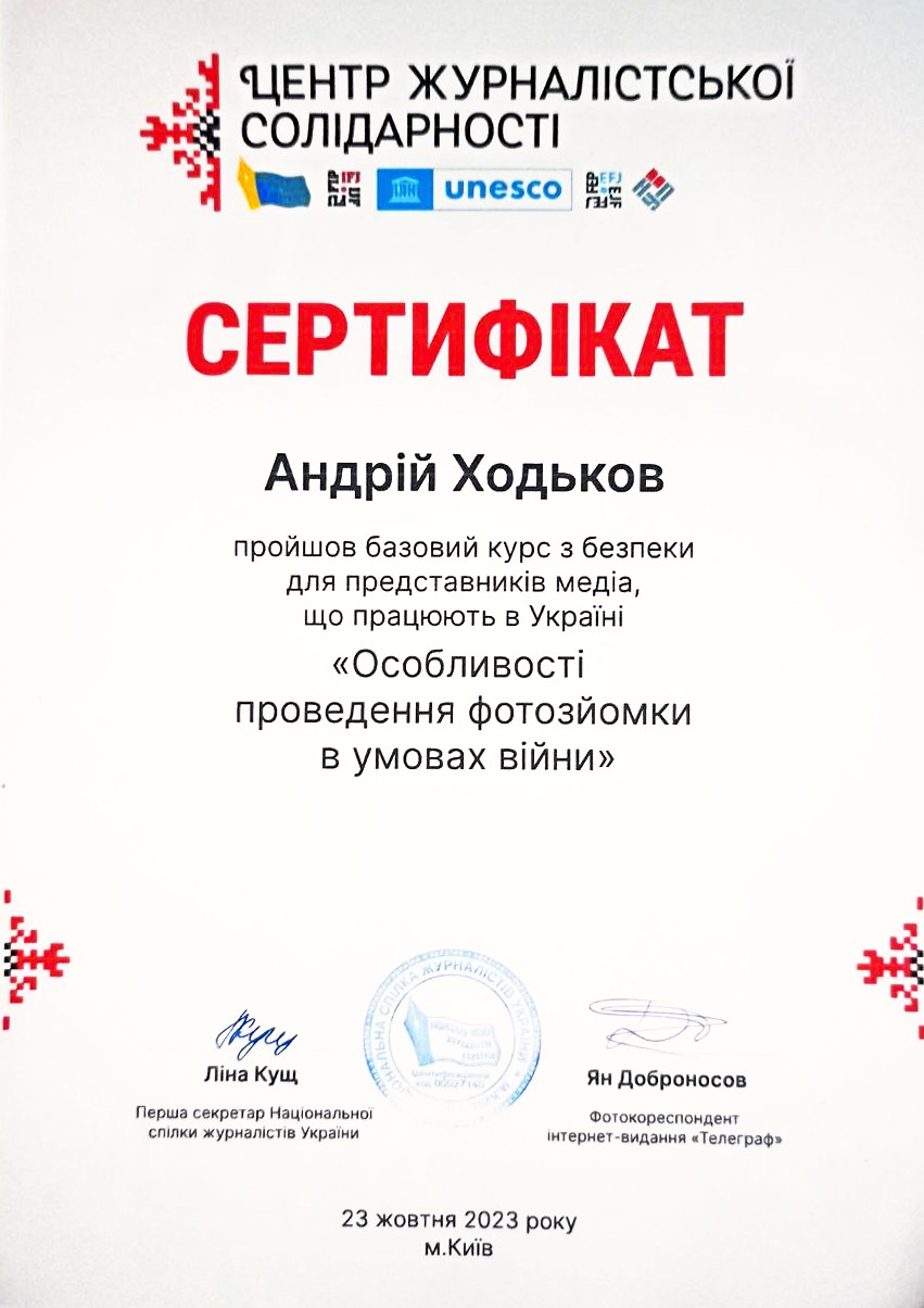 23 жовтня 2023 року здобувачка III курсу освітньої програми «Міжнародна журналістика» Руденко Вікторія РУДЕНКО та здобувач II курсу освітньої програми «Міжнародна журналістика» Андрій ХОДЬКОВ взяли участь у тренінгу «Особливості проведення фотозйомки в умовах війни», який проводила Мережа Центрів журналістської солідарності НСЖУ.