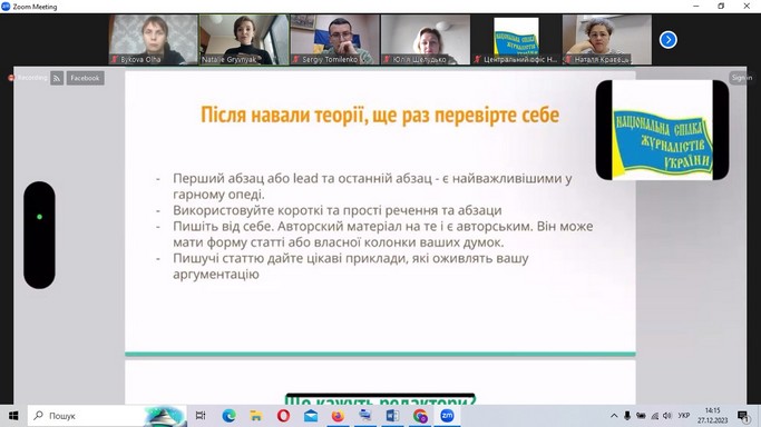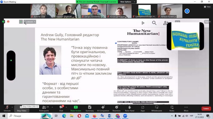 27 грудня 2023 року доцент кафедри міжнародної журналістики Ольга БИКОВА взяла участь у вебінарі «Авторська позиція у журналістиці», організований Національною спілкою журналістів України та організацією N-Ost.