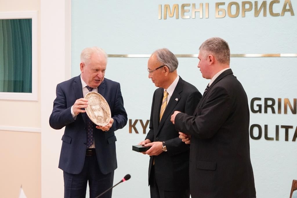 Наприкінці зустрічі Послу була вручена найвища університетська нагорода – медаль Бориса Грінченка, а також презентовані подарунки, створені руками студентів та викладачів. Гармонійним завершенням заходу стала модерна японська музична п’єса в майстерному виконанні викладача Факультету музичного мистецтва і хореографії.