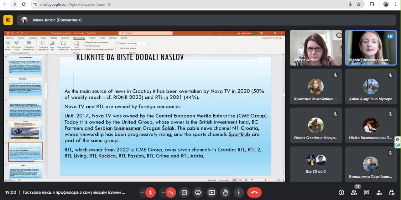 3 травня 2024 року відбулася гостьова лекція Єлени Юришич, професора з комунікацій Сплітського Університету, на тему "Сучасна журналістика: приклад Хорватії" ("Comteporary journalism: case of Croatia").