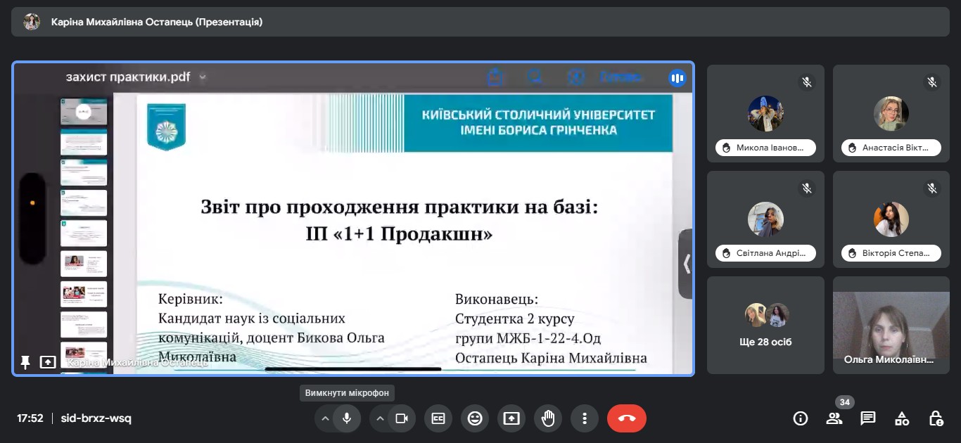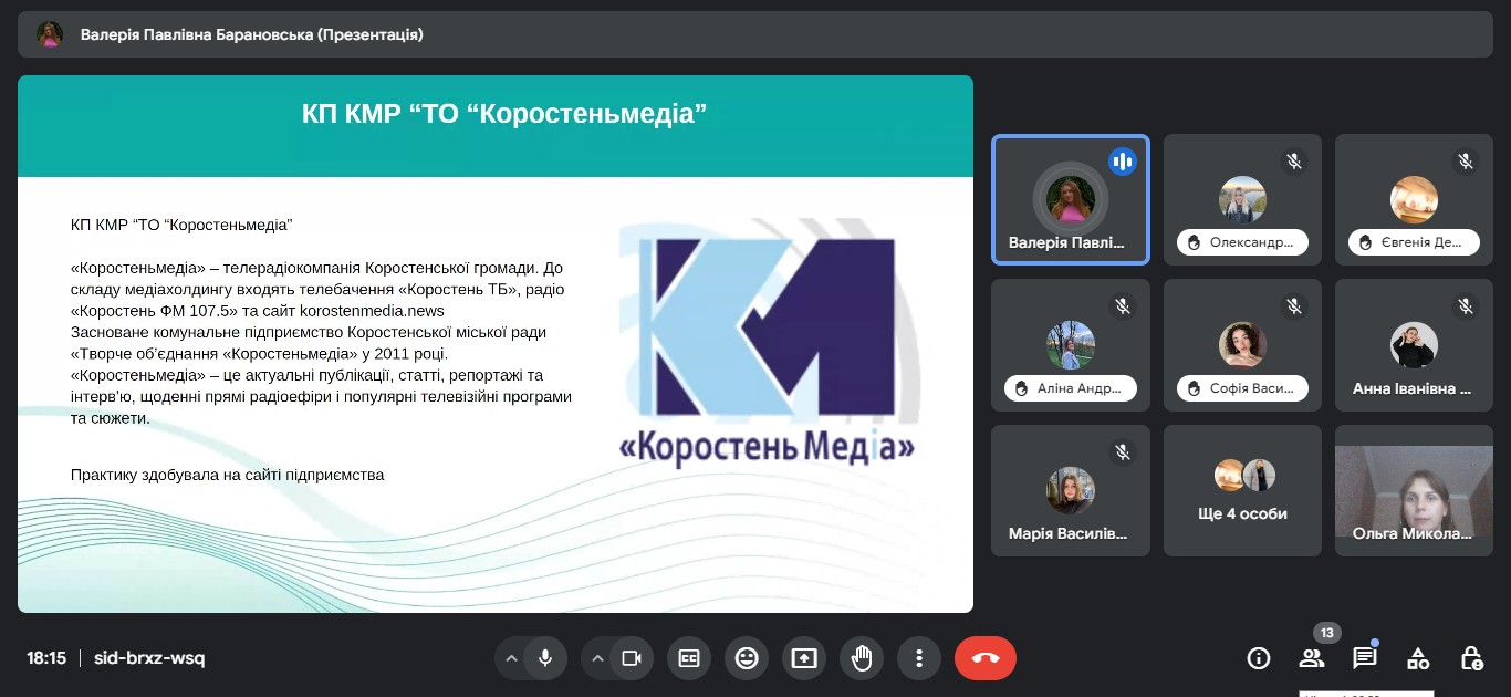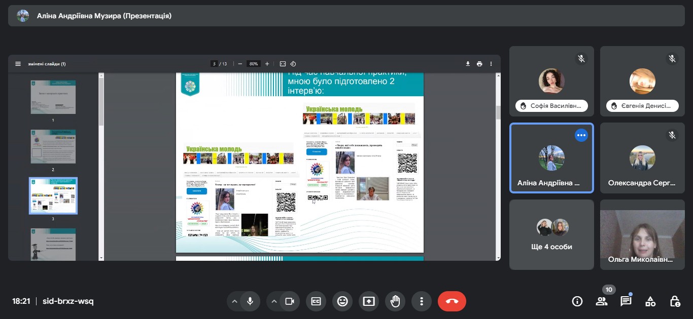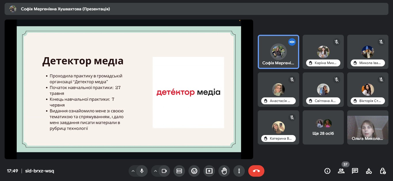 Звітна конференція відбулася на платформі Google Meet за модерування керівника практики від університету доцента кафедри міжнародної журналістики Ольги БИКОВОЇ.