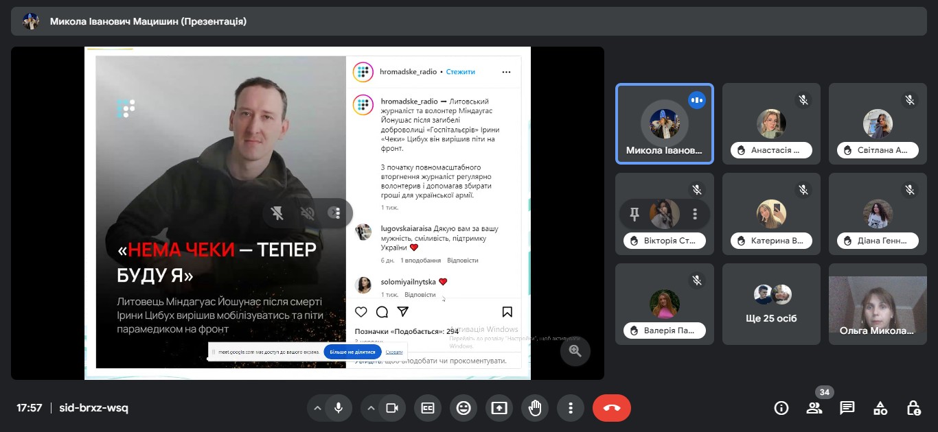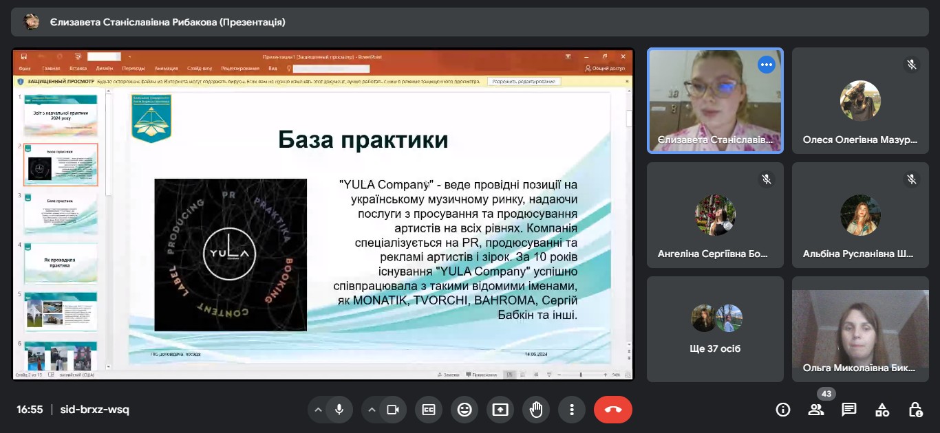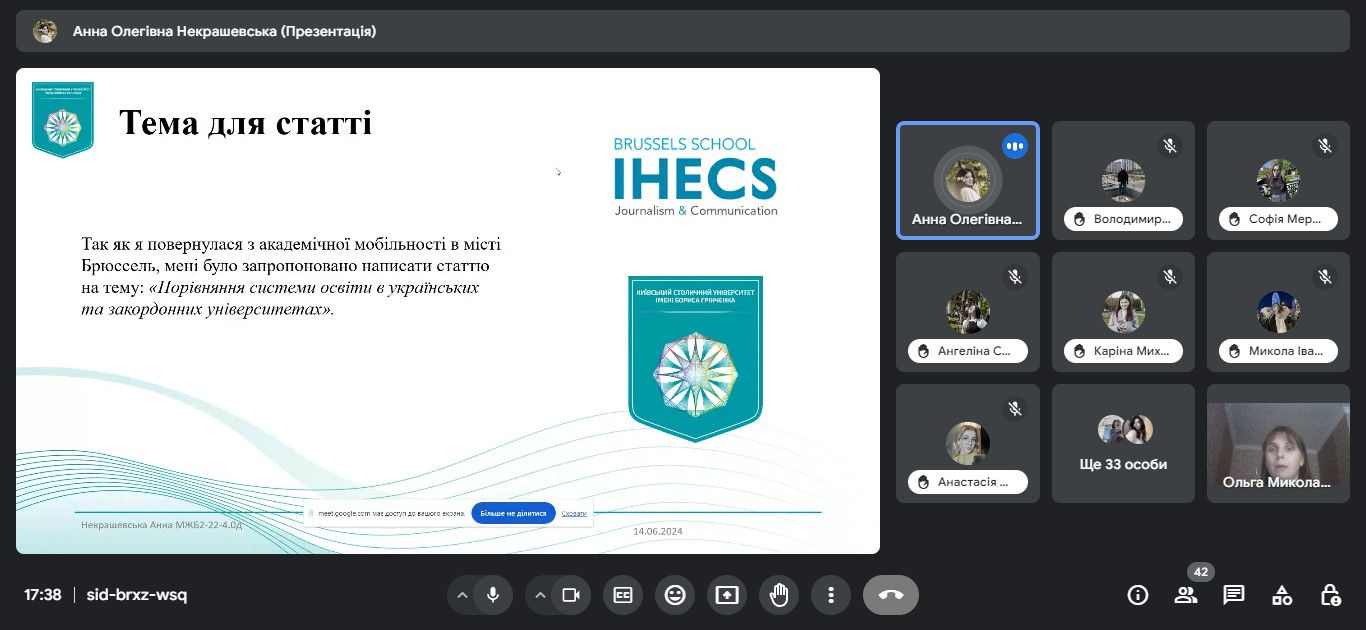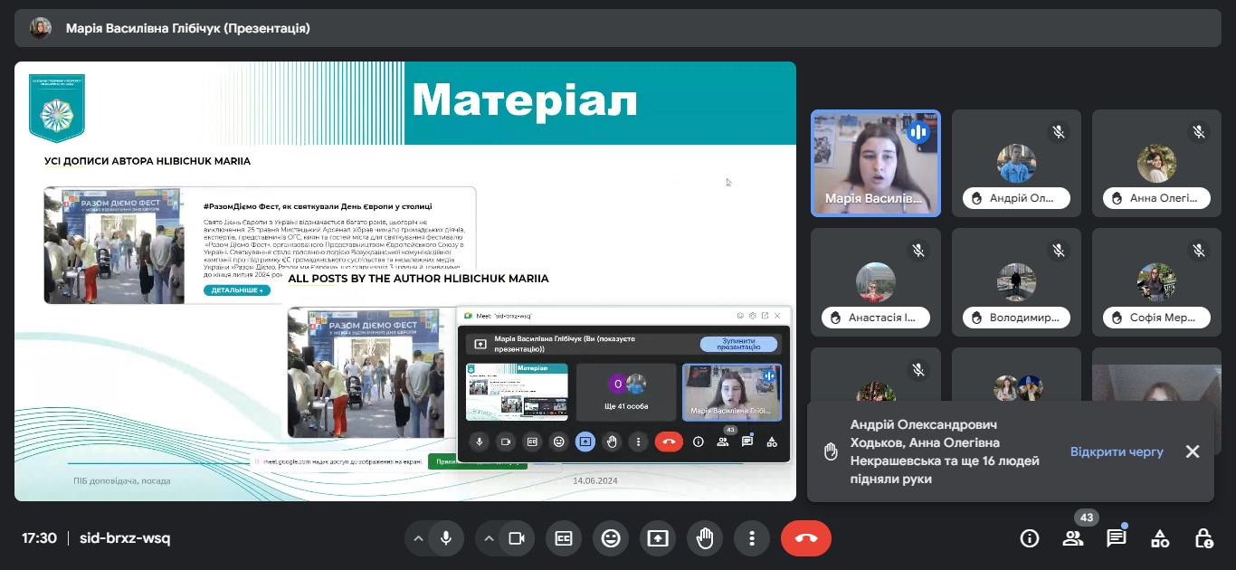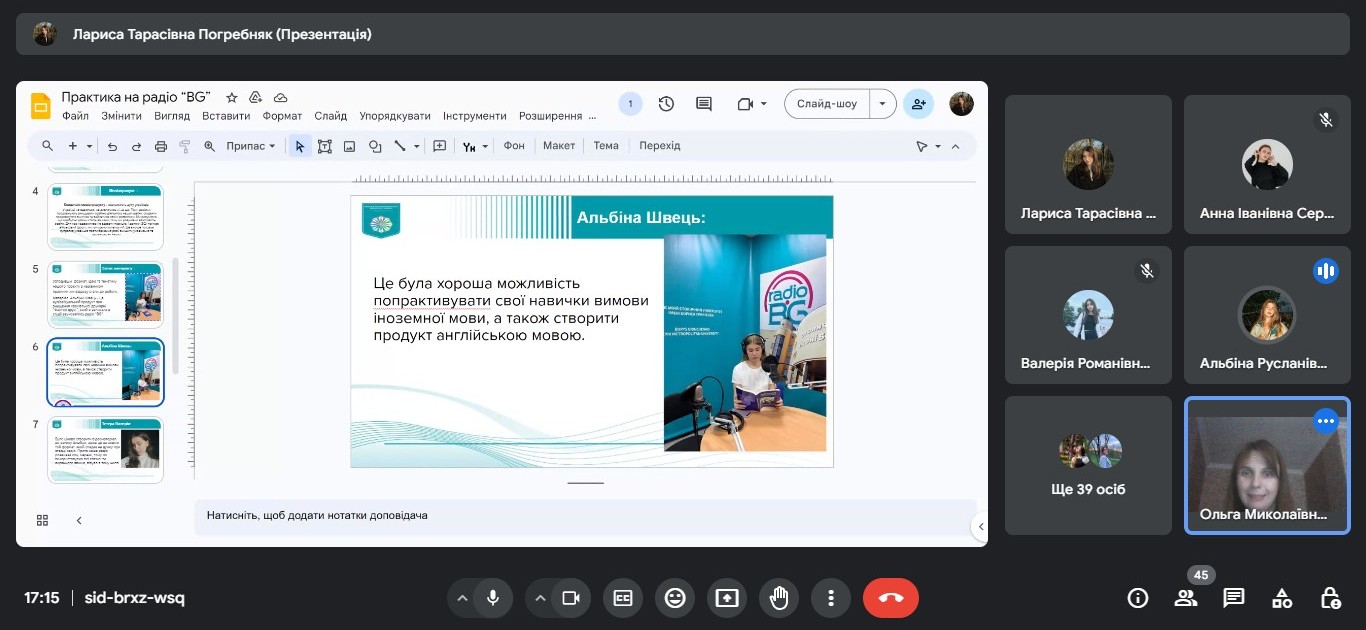 Звітна конференція відбулася на платформі Google Meet за модерування керівника практики від університету доцента кафедри міжнародної журналістики Ольги БИКОВОЇ.