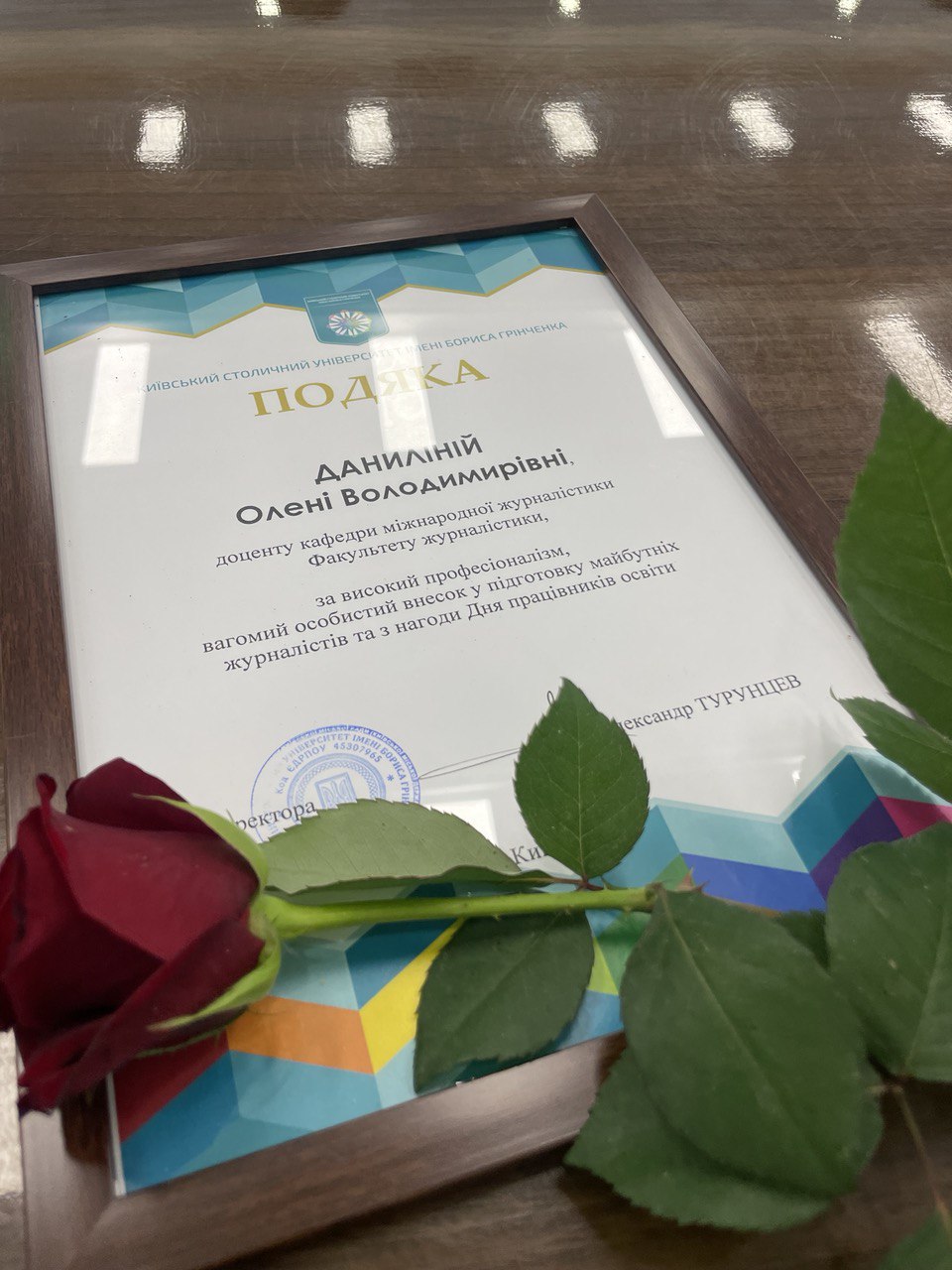 Подяку від Київського столичного університету імені Бориса Грінченка отримала Олена ДАНИЛІНА, доцент кафедри міжнародної журналістики.