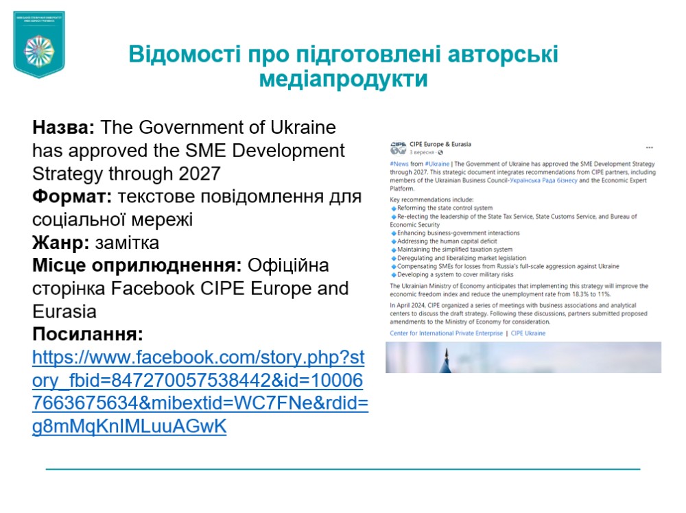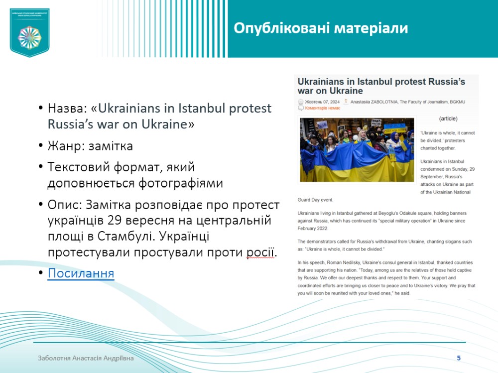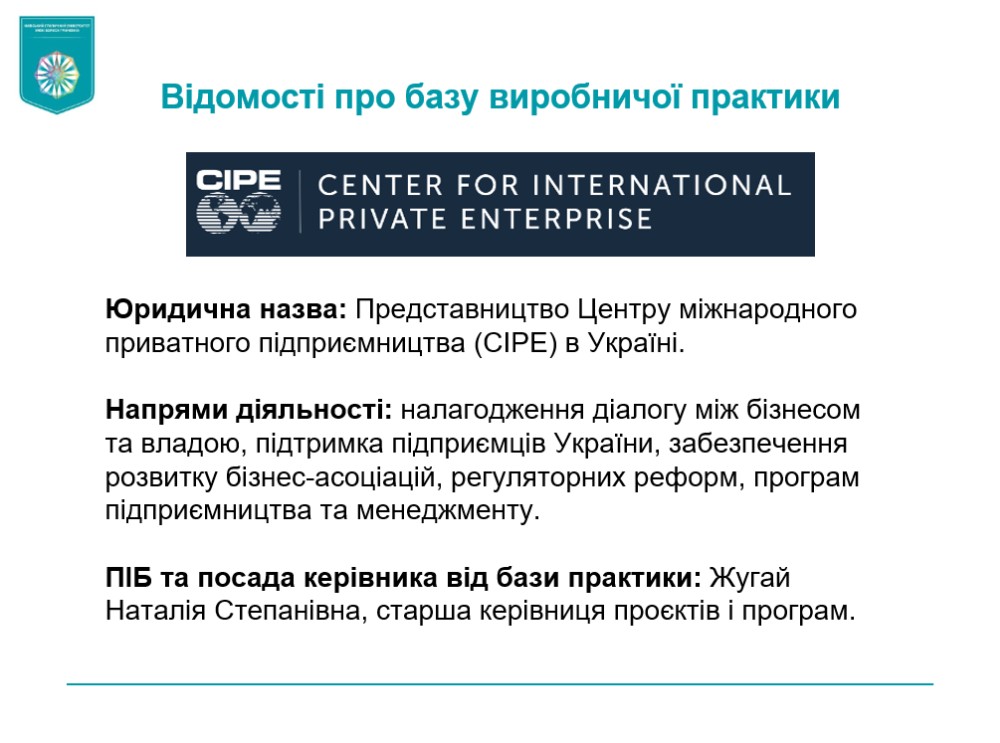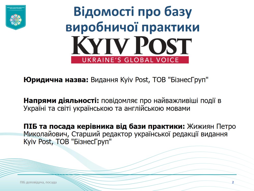 Практика проходила з 2 вересня по 23 жовтня 2024 року на базі таких інституцій, як Міжнародний центр підтримки підприємництва CIPE, Державна установа «Український інститут», пресслужба Національного антикорупційного бюро України, Комунальне підприємство «Київ інформ», ТОВ «1+1 ІНТЕРНЕТ», видання «Kyiv Post», інтернет-медіа «YULA News», медіахолдинг «NV» тощо.