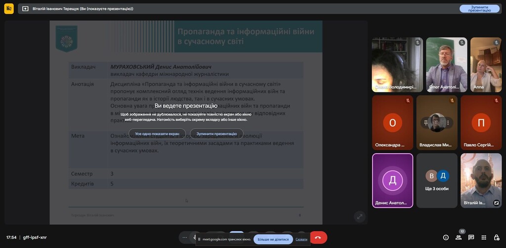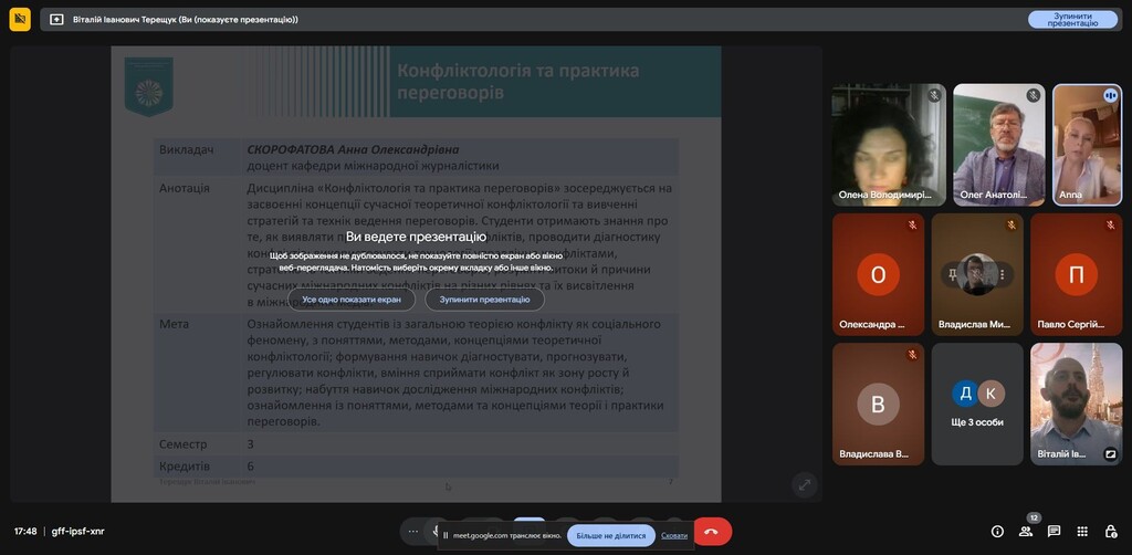 Гарант освітньої програми Віталій Терещук розповів про процедуру вибору і відповів на запитання здобувачів. У зустрічі також взяли участь викладачі кафедри, які представили свої вибіркові дисципліни: професор Олег Семенюк, доцент Олена Даниліна, доцент Анна Скорофатова, викладач Денис Мураховський.