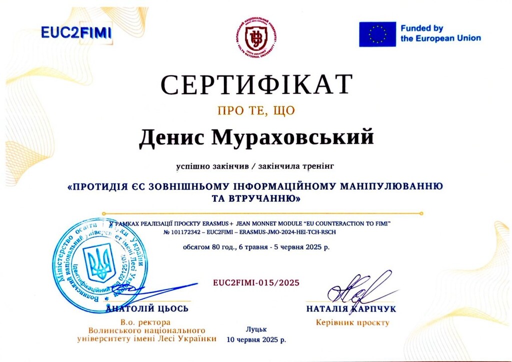 У травні–червні 2025 року співробітники кафедри міжнародної журналістики завідувач Віталій Терещук, доцент Ольга Бикова та викладач Денис Мураховський проходили тренінг «Протидія ЄС зовнішньому інформаційному маніпулюванню та втручанню», проведеному кафедрою міжнародних комунікацій та політичного аналізу Волинського національного університету імені Лесі Українки.