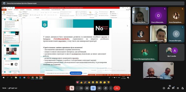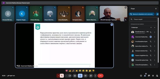 Під час конференції студенти прозвітували про форми роботи та завдання, які вони виконували під час практики в рамках підготовки своїх кваліфікаційних робіт, обговорили компетентності та навички, які отримали при виконанні завдань, розповіли про свої враження від проходження практики.