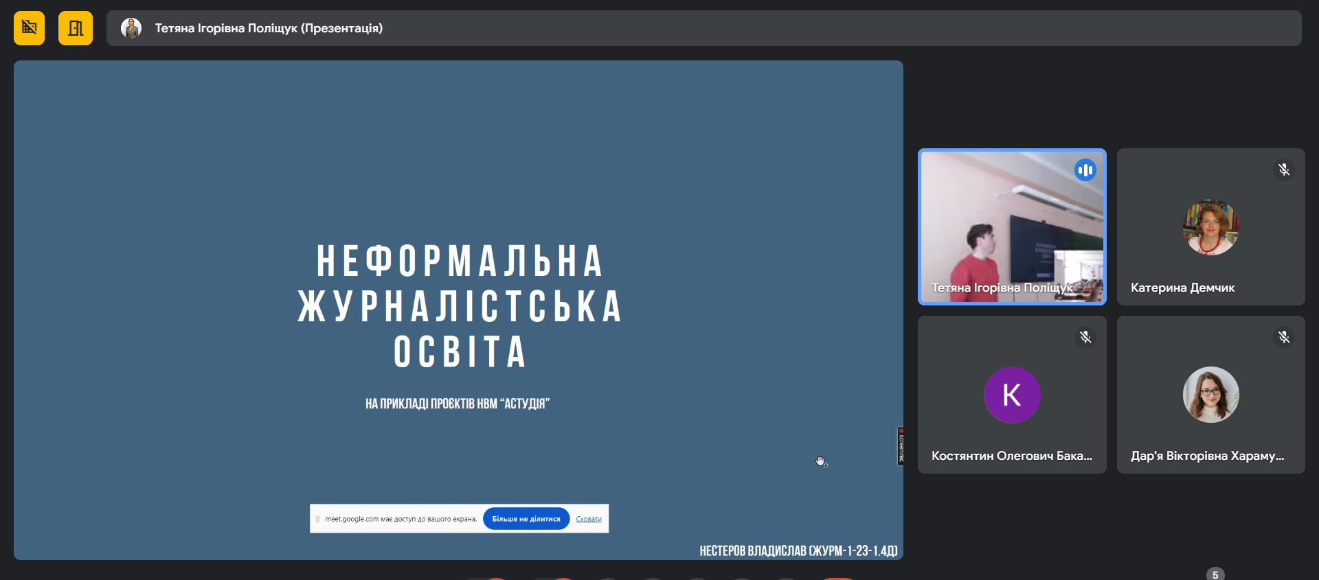 Завідувачка НВМ тележурналістики Мар’яна Ангелова розповіла про проєкти Астудії, які студенти створюють у межах навчальної програми «Тележурналістика», також дала поради стосовно того, як подолати затиски та відторгнення від свого твору. Саме вони заважають автору ефективно просувати публікацію. «Дуже часто молоді автори стикаються зі страхами провалу, невідповідність результату первинному задуму, невдоволення власним виглядом тощо, проте від цього є ефективні ліки, – порадила досвідчена журналістка та викладач з 20-ти річним досвідом. – Свідоме виконання технології задля підвищення якості вашого контенту, а ще робота з удосконалення власного “Я”, нарощення творчого потенціалу!»