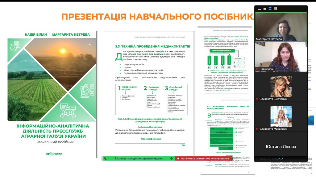 На лекції також відбулася презентація навчального посібника проф. Н. І. Білан та доц. М.М. Нетреби "Інформаційно-аналітична діяльність пресслужб аграрної галузі України". Ця спільна робота є універсальним помічником студентам по комунікаціях, зокрема з активними посиланнями, які легко інтегрують посібник в інтернет-простір, дають змогу проілюструвати теорію практичними прикладами та кейсами діяльності пресслужб. Повнотекстова версія посібника розміщена у вільному доступі у репозиторії за посиланнями: https://elibrary.kubg.edu.ua/id/eprint/42626/