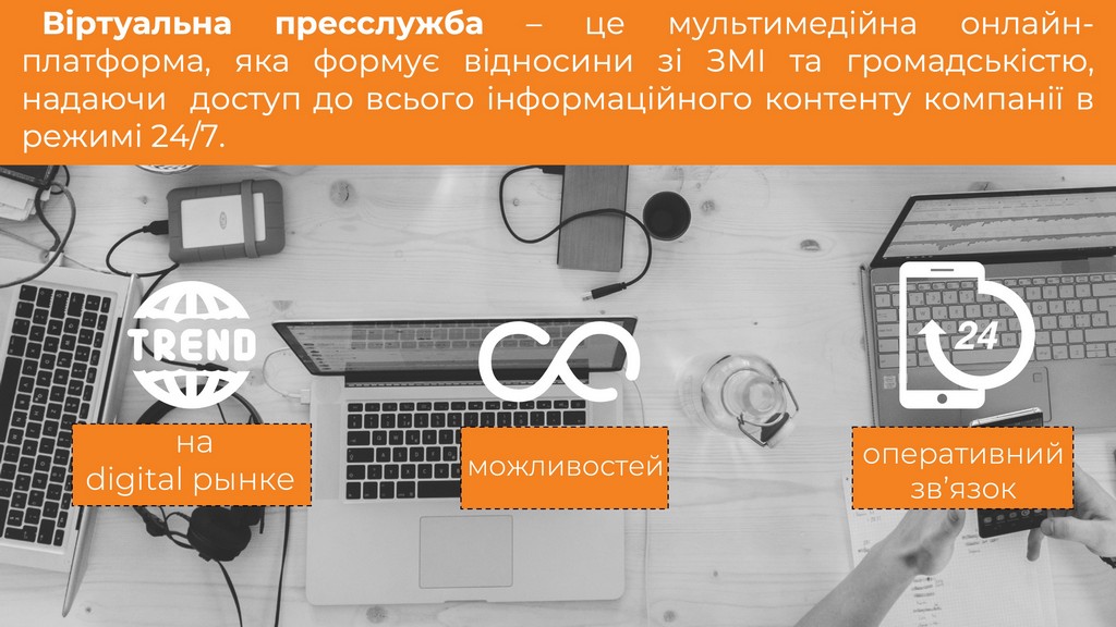 Головну увагу лекторка приділила суттєвим перевагам роботи віртуальної пресслужби у порівнянні з традиційною пресслужбою, а саме формуванню єдиного першоджерела для ЗМІ та мінімізації ризиків публікації застарілих або недостовірних даних з інших вебресурсів; оперативному отриманню первинної інформації про компанію представниками масмедіа в режимі 24/7; збільшенню ймовірності виходу позитивних і коректних публікацій у ЗМІ; демонстрації професіоналізму прессслужби та відкритості компанії; отриманню переваг у конкурентній боротьбі за прихильність масмедіа.
