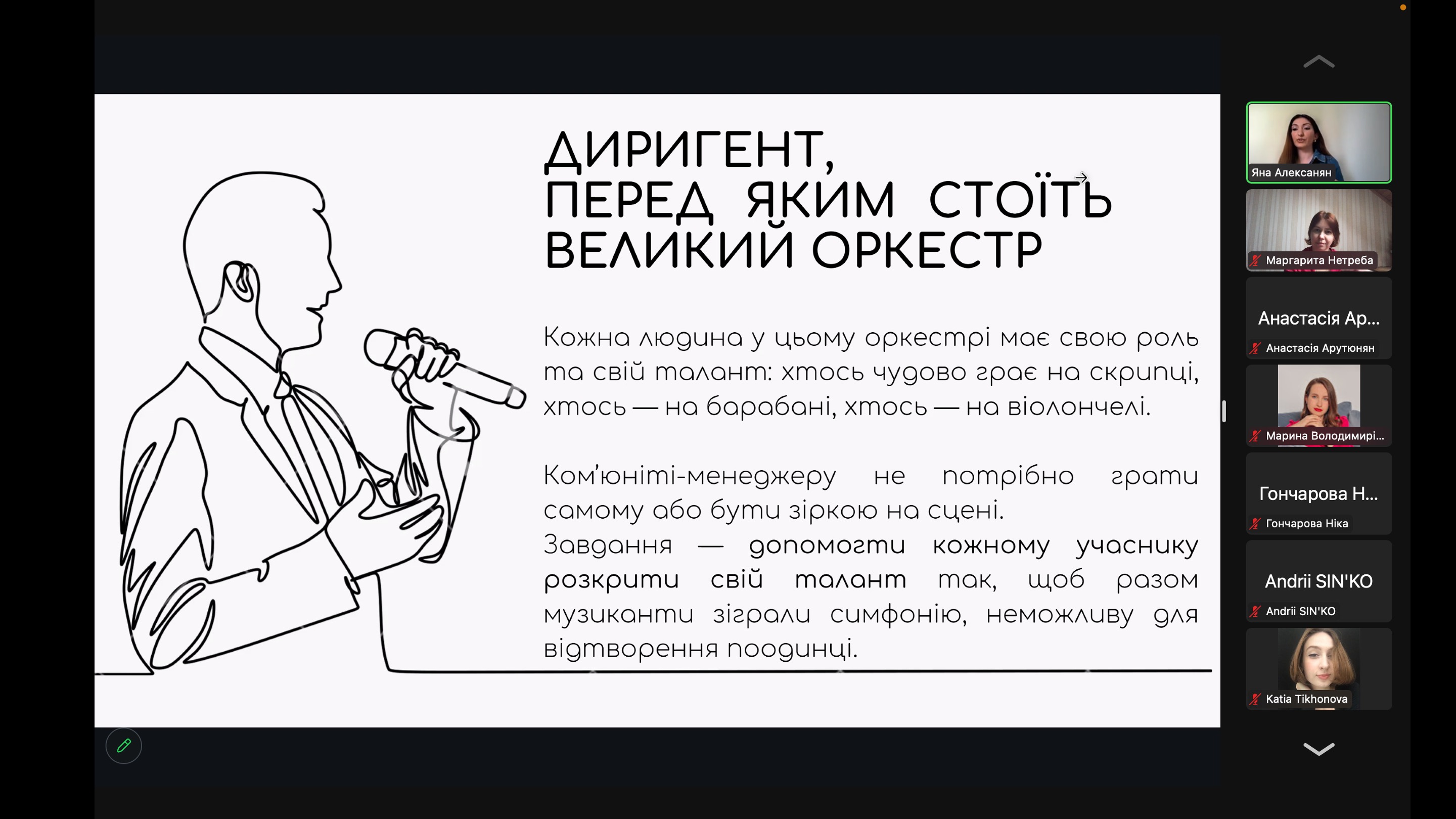 “Ми об’єднуємо бізнесменів в професійне ком’юніті для спілкування, розвитку та співробітництва. Тому моя роль — модерувати взаємодію учасників ком’юніті: знайомство, інтеграцію, комунікацію, обмін досвідом. Коли робота виконується постійно та професійно, роль ком’юніті-менеджменту залишається непомітною. Але якщо забути про важливість спрямування енергії в цей напрямок, жодне співтовариство не зможе існувати довго” - каже лекторка.