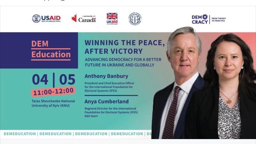 4 травня 2023 року в рамках курсу «Демократія: від теорії до практики» відбулася зустріч студентів українських вишів з президентом Міжнародної фундації виборчих систем (IFES) паном Ентоні Банбурі та регіональною директоркою Міжнародної фундації виборчих систем (IFES) у Європі та Євразії пані Анею Камберленд. Серед учасників лекції були й ми, студенти Київського університету імені Бориса Грінченка з викладачкою курсу «Демократія: від теорії до практики» доцентом Ольгою Стадніченко.