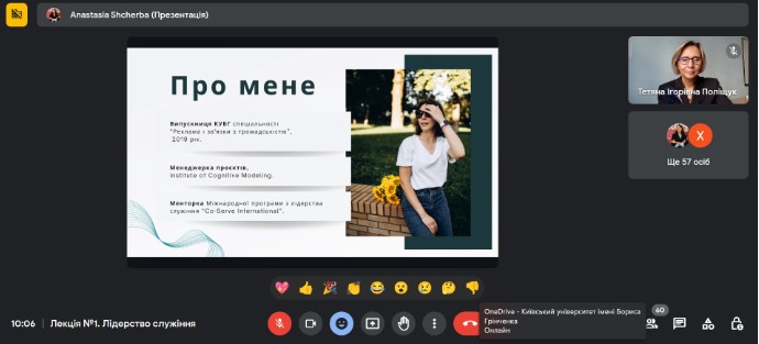 28 вересня 2023 року до першокурсників ОП «Реклама і зв’язки з громадськістю» на лекцію з Лідерства служіння завітала випускниця кафедри Анастасія Щерба, в минулому співробітниця Центру програм з лідерства служіння Університету Грінченка, а нині менеджер проєктів в “Institute of Cognitive Modeling”. Анастасія радо поділилася зі студентами власним шляхом до лідерства, страхами які довелося подолати та успіхом, який не забарився.