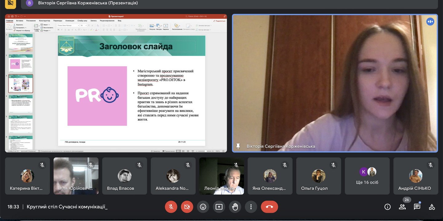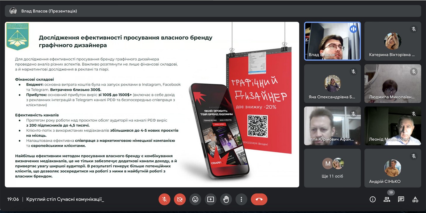 Виступили аспіранти – викладачі нашої кафедри (О.Курпас, Т.Поліщук, Є.Селюх, А.Сінько), а також здобувачі другого (магістерського) рівня вищої освіти ОП "Реклама і зв'язки з громадськістю" В. Власов, В. Снопкова (2022 р. вступу) та В. Скіпор (2023 р. вступу).