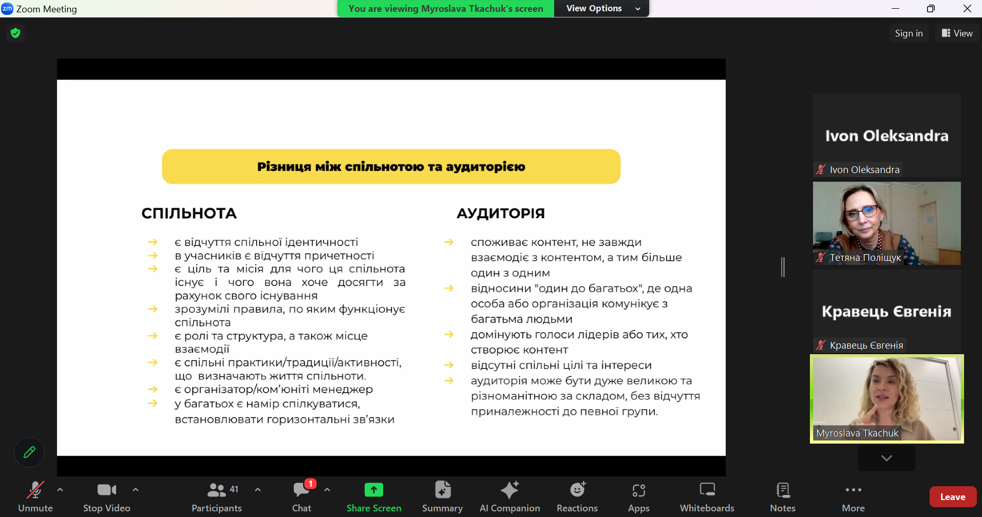 - Що таке спільноти та їхня типологія? Мирослава пояснила, що спільноти можуть бути різних типів: професійні, соціальні, інтересів та інші. Вона підкреслила важливість розуміння різних видів спільнот та їхньої ролі в сучасному цифровому світі.