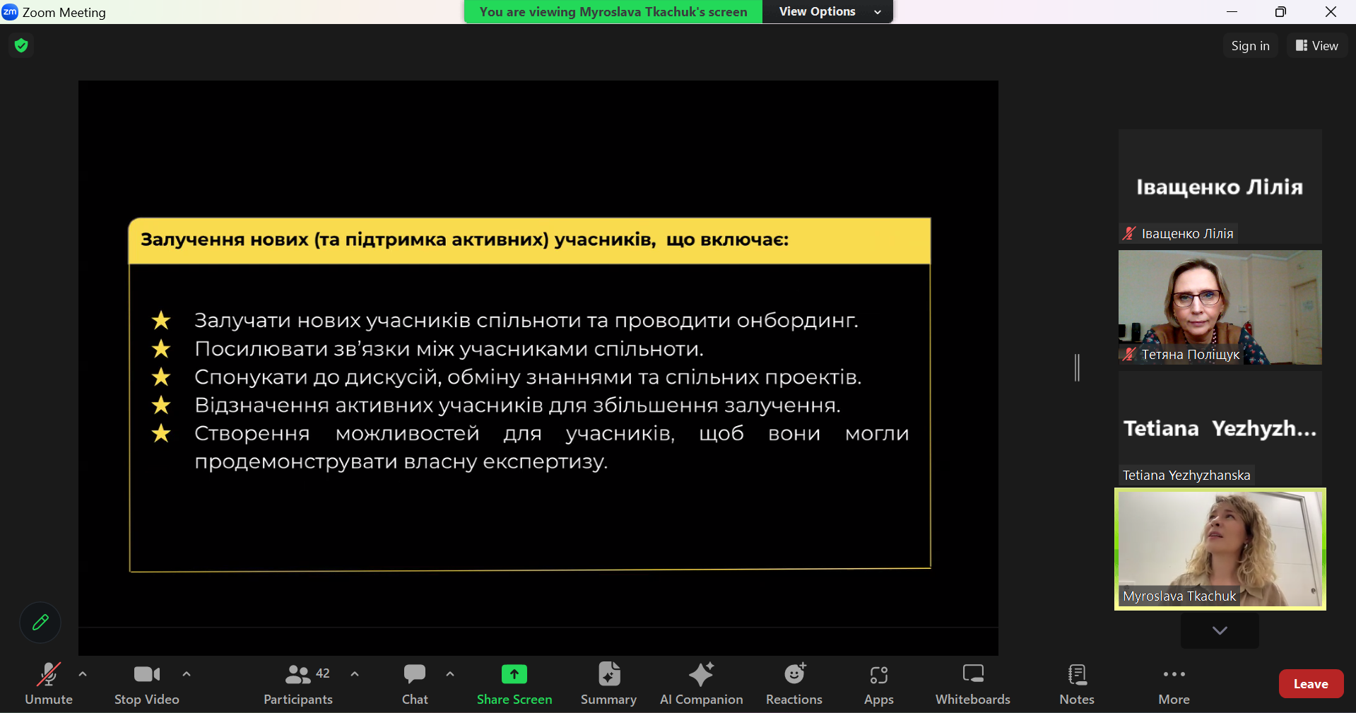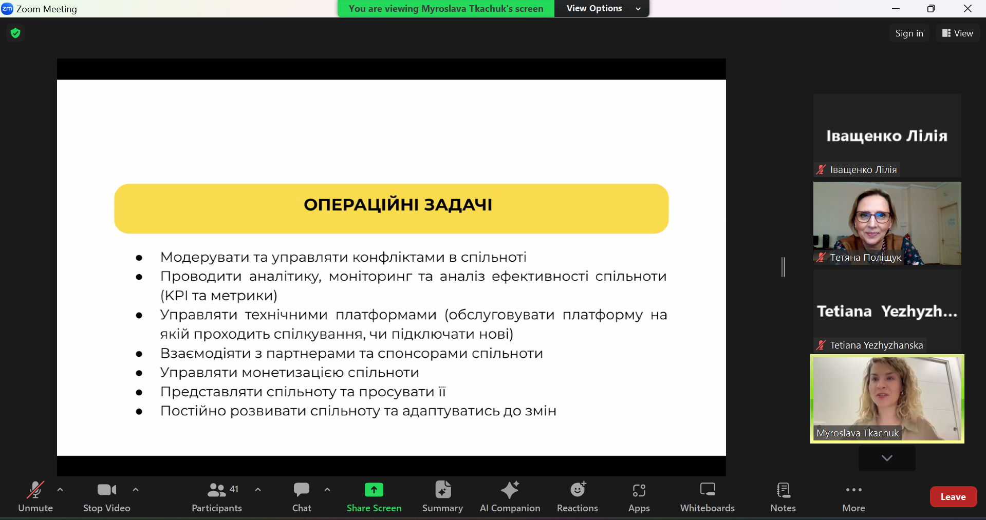 - Community Canvas. Під час лекції Мирослава представила Community Canvas — інструмент для планування та розвитку спільнот. Вона пояснила, як використовувати цей інструмент для створення структури спільноти, визначення її цінностей, місії та стратегій розвитку.