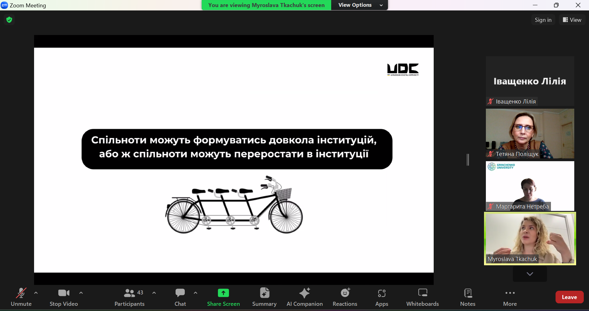 11 червня 2024 року в межах дисципліни «Ком’юніті менеджмент» відбулася онлайн-лекція на тему «За лаштунками спільнот: хто і як управляє спільнотою, команда, портрет комʼюніті менеджера», яку провела ком’юніті-менеджерка, співзасновниця та CEO Ukrainian Digital Community — Мирослава Ткачук.