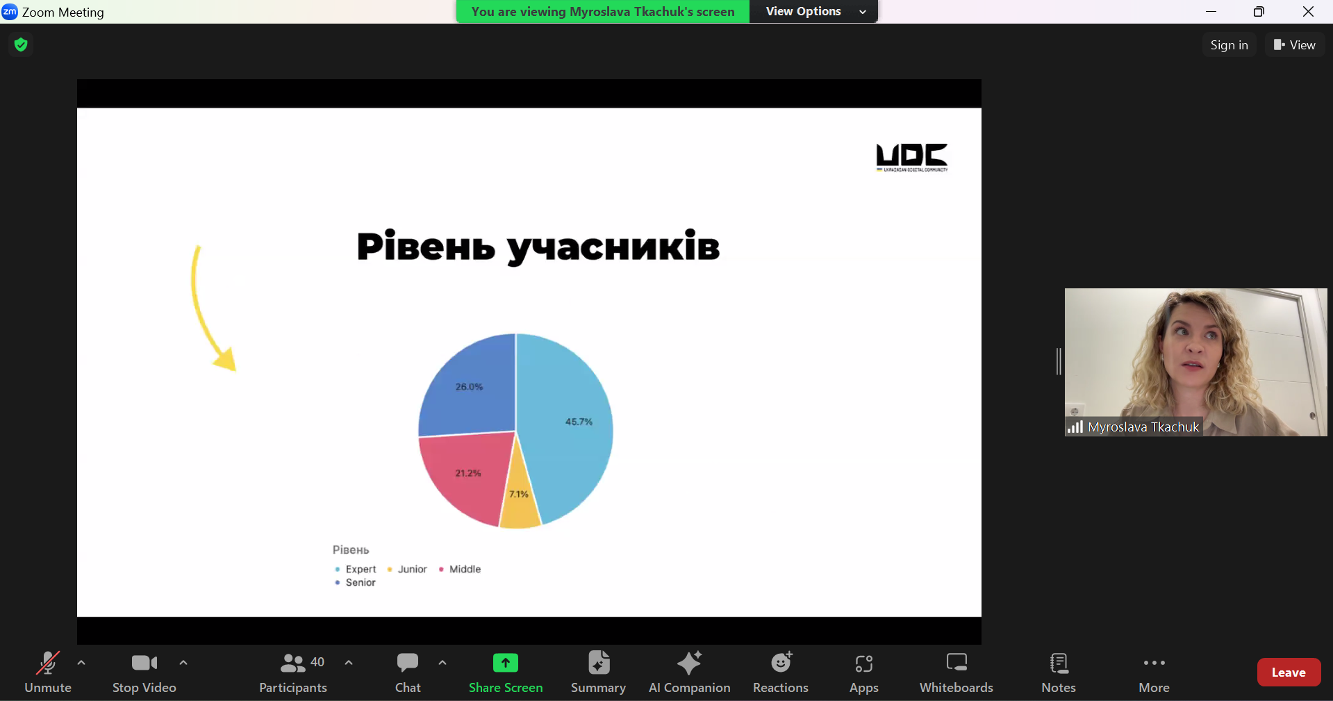 Усі слухачі отримали від зустрічі неймовірну користь та позитивні емоції від спікерки. Мирослава надала розгорнуті відповіді на запитання, а головне, надихнула присутніх на подальше навчання та професійний розвиток, демонструючи приклад захопленості своєю професією.