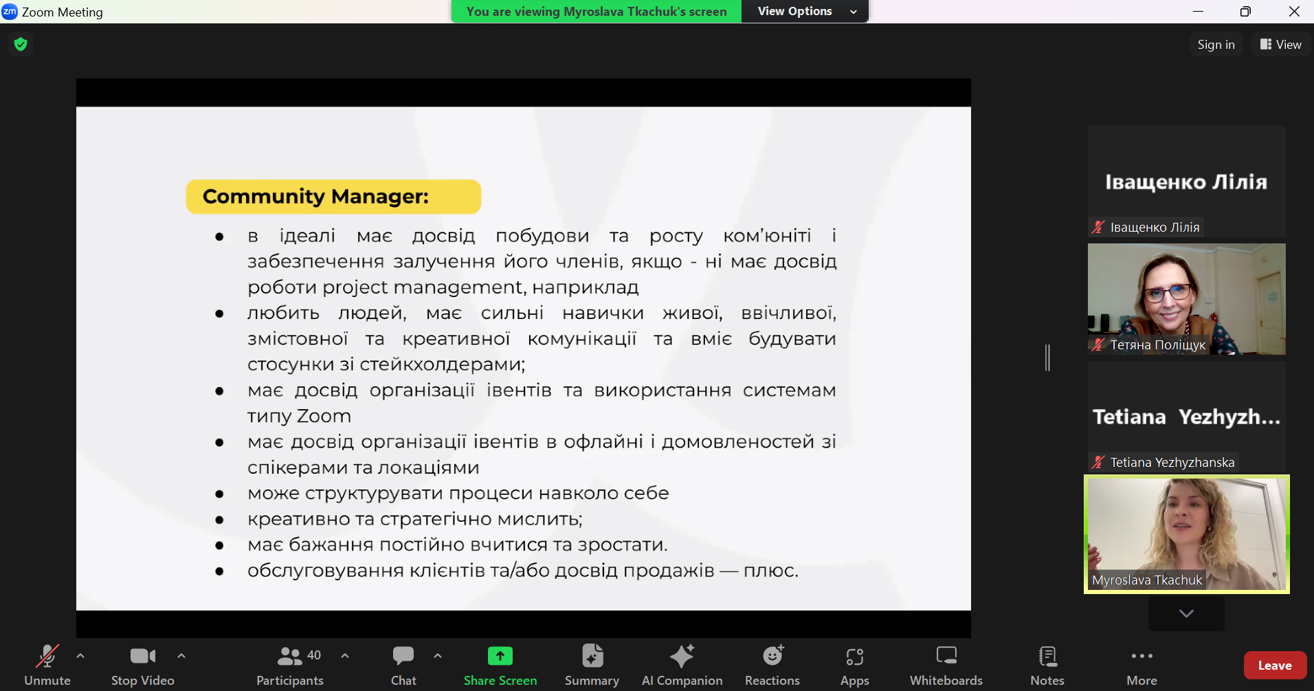 - Хто такий комʼюніті менеджер? Мирослава детально розповіла про роль комʼюніті менеджера, його основні завдання, такі як залучення та підтримка учасників спільноти, створення контенту та модерація обговорень. Вона також описала, які навички потрібні для успішного виконання цієї ролі.
