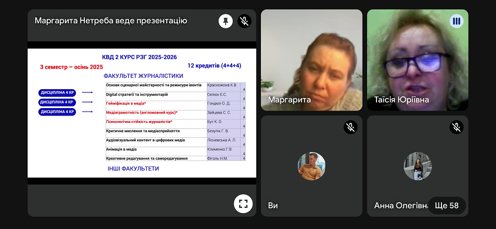 Вибіркові дисципліни представила Таїсія Бєлофастова, заступниця завідувача кафедри з науково-методичної та навчальної роботи. Також про окремі вимоги до навчання та вибору дисциплін для подальшого вивчення розповіла Маргарита Нетреба, гарант бакалаврської освітньої програми «Реклама і зв'язки з громадськістю».