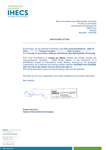 16-23 лютого 2026 року ст. викладача кафедри реклами та зв’язків з громадськістю Ірину Кузнєцову запросили відвідати IHECS (Institut des Hautes Etudes des Communications Sociales) – Haute Ecole Galilée. Там вона проведе, зокрема, відкриту лекцію для іноземних студентів та викладачів IHECS. Тема - "The Truth Is Not Enoug. Why Facts Need Emotions to Win the War" («Правди недостатньо. Чому фактам потрібні емоції, щоб виграти війну»).