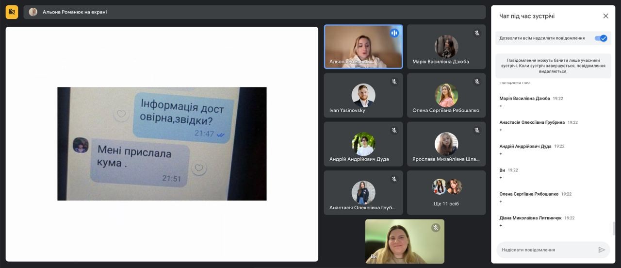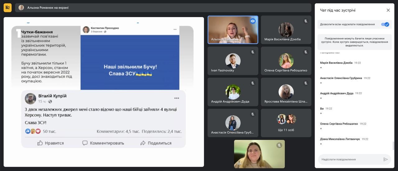 19 квітня 2023 року відбулася гостьова лекція Альони Романюк, фактчекерки та медіаекспертки, яка розповідала про фейки, маніпуляції, інформаційні вкиди та правила перевірки інформації на достовірність для майбутніх журналістів.