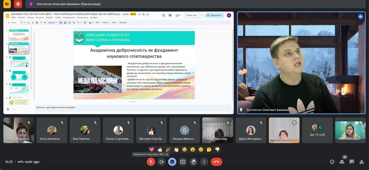 9 листопада 2023 року кафедра журналістики та нових медіа Факультету журналістики Київського університету імені Бориса Грінченка провела онлайн-круглий стіл «Академічна доброчесність і виклики науки у кризових ситуаціях: український досвід та європейські практики».