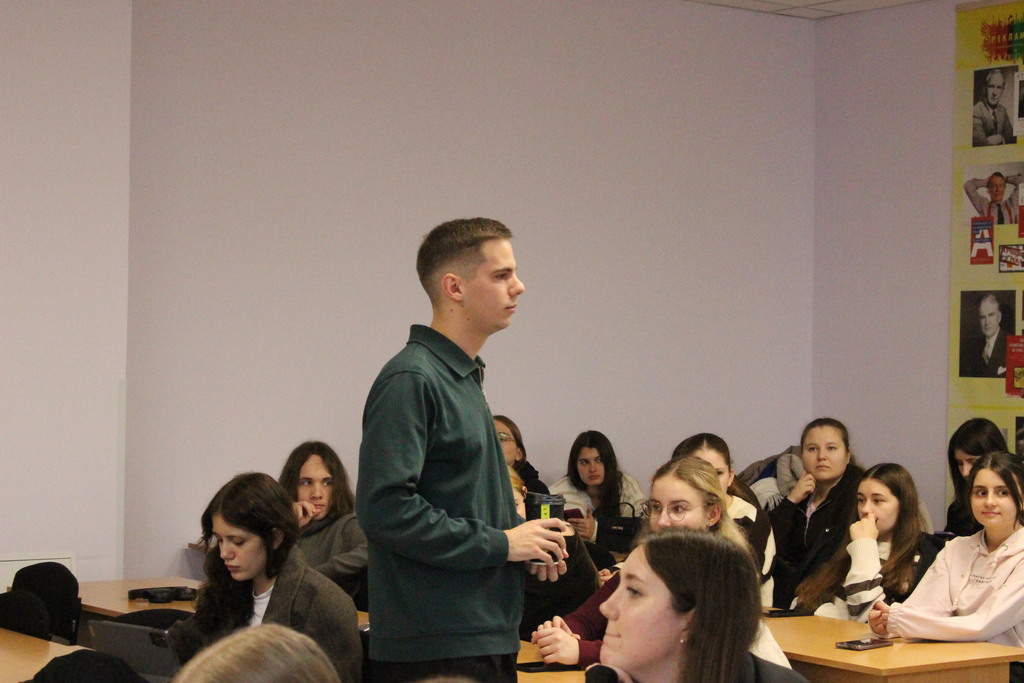 Роман, який у червні успішно захистив бакалаврський проєкт, тепер повернувся до рідного ЗВО вже в ролі спікера. Розповідав про дезінформацію, телеграм-канали, а також про те, як журналісту не потонути в морі (та де там морі – океані!) фейків.