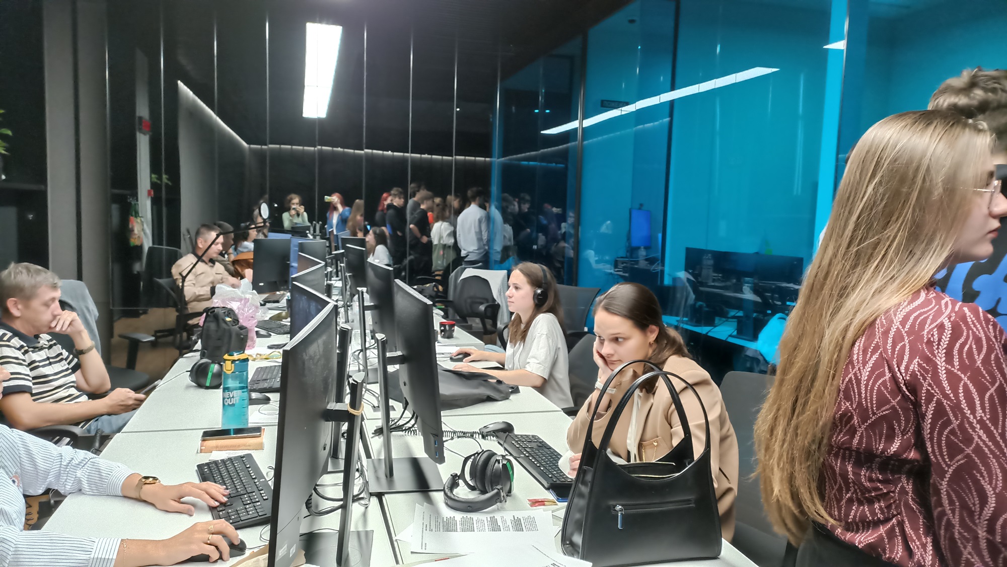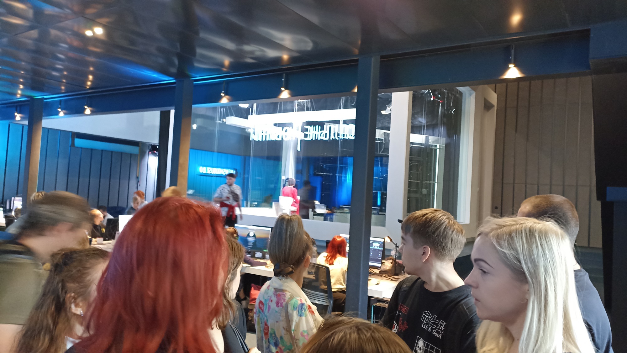 А потім їх запросили всередину Національної суспільної телерадіокомпанії України, де з порогу відчувалася особлива атмосфера Суспільного мовника. Майже відразу вони потрапили на центральну «кухню» медіавиробництва – в ньєзрум головних новин країни. Студентам надали можливість оглянути закадровий процес створення прямоетерних новин.
