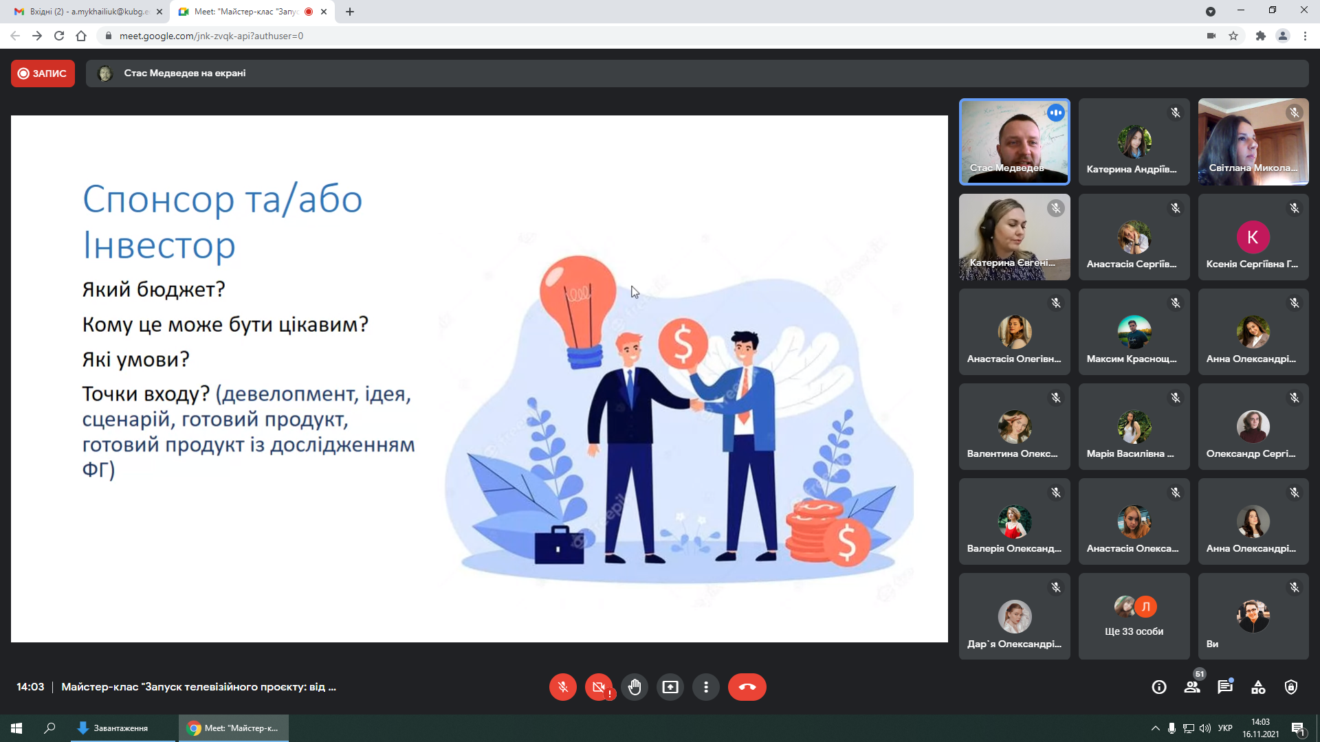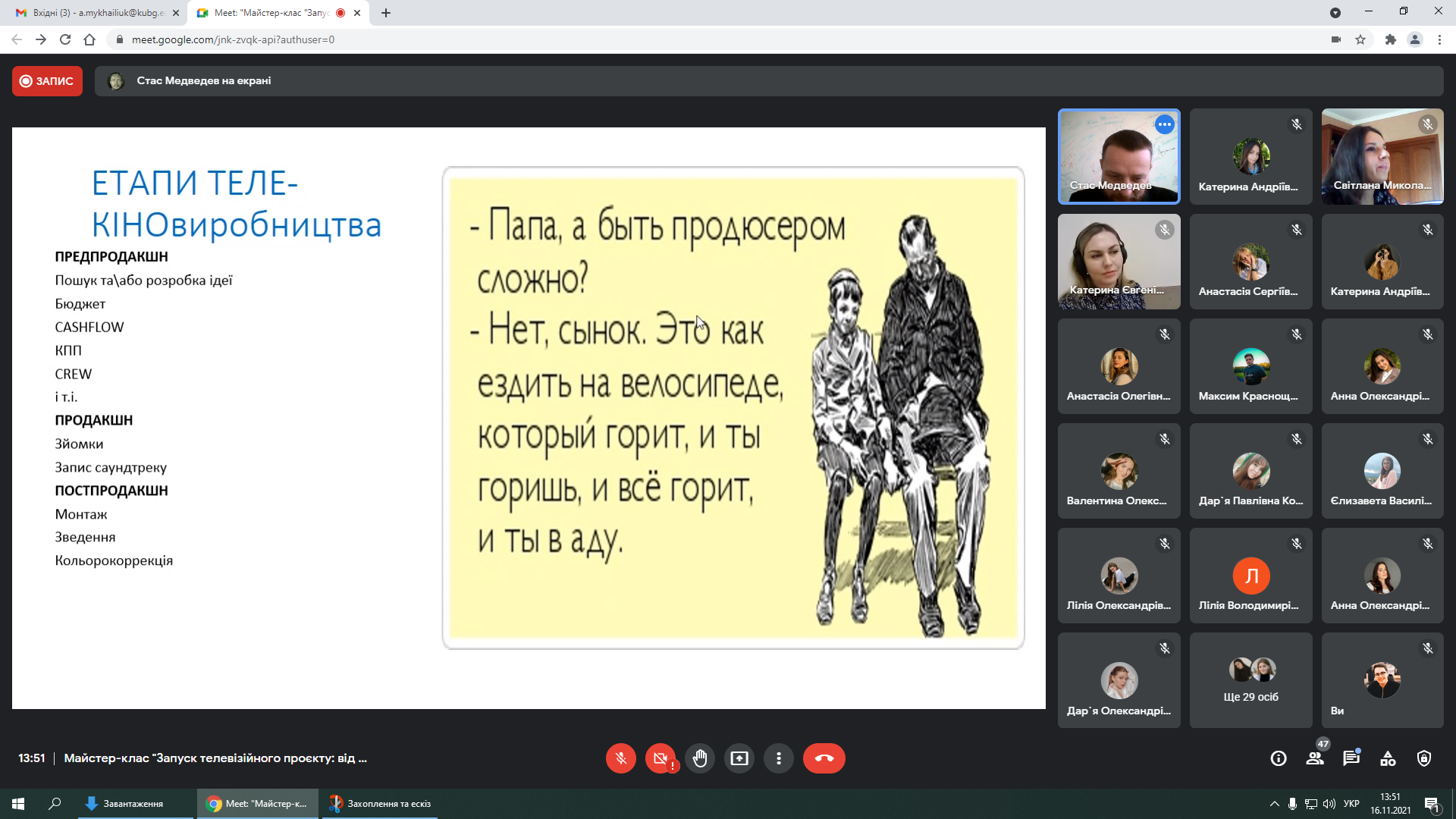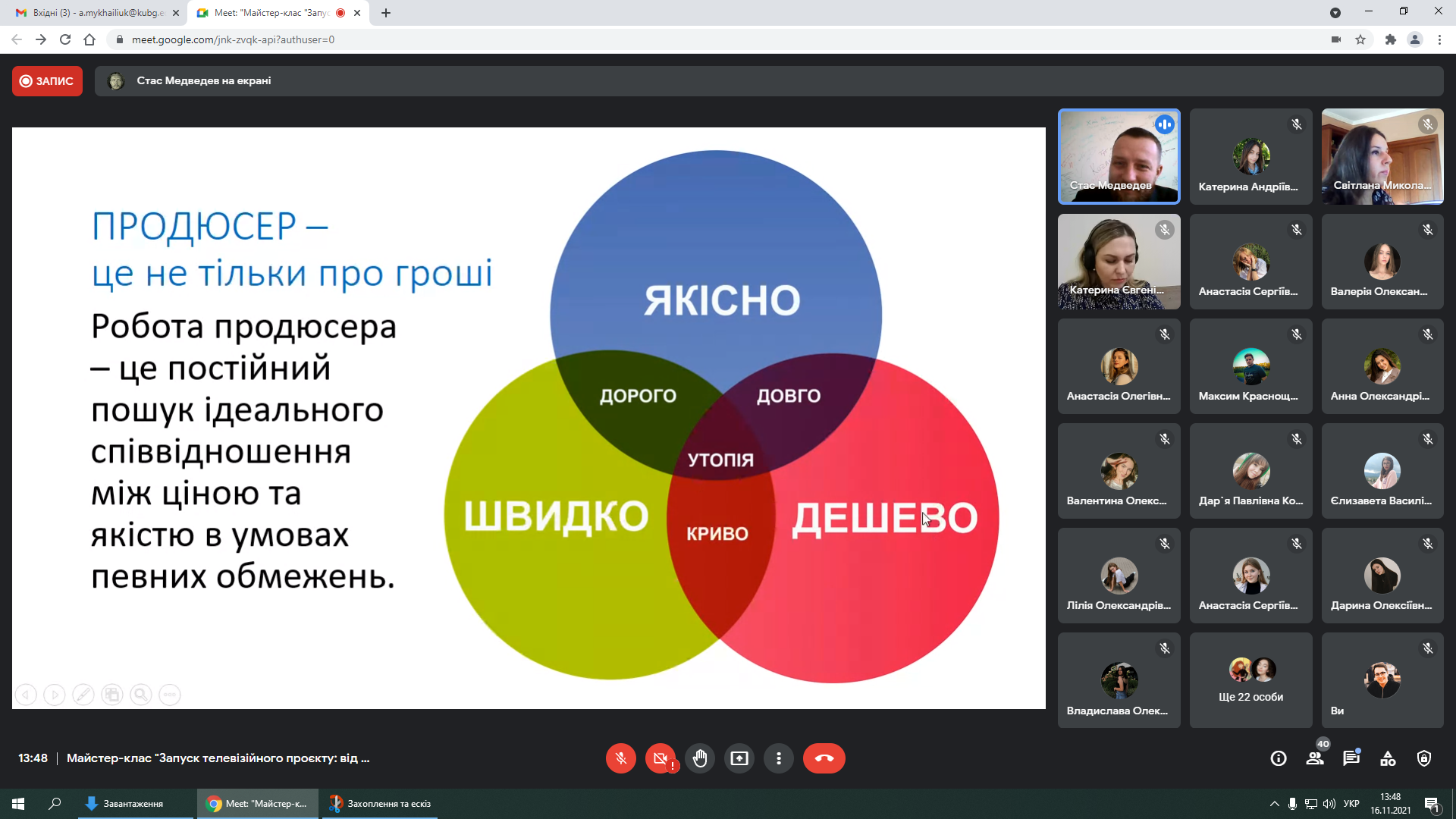 Онлайн-захід одразу розпочався з розмови про телевізійні проєкти. Пан Станіслав розповів про етапи теле- і кіновиробництва, про роботу продюсера та технологічну команду проєктів. Крім того, Станіслав поділився власним досвідом щодо роботи на ТБ, розповів про обов’язкові умови до початку виробництва проєкту та який повинен бути підхід до роботи за екраном. Студенти ставили багато запитань, зокрема їх цікавив аспект спонсорства та інвестування (про бюджет, умови, точки входу тощо) та обов’язки продюсерів-кріейторів. Станіслав не тільки відповів на всі запитання, а й продемонстрував студентам інфографіки й схеми усіх необхідних аспектів для запуску телевізійного проєкту.