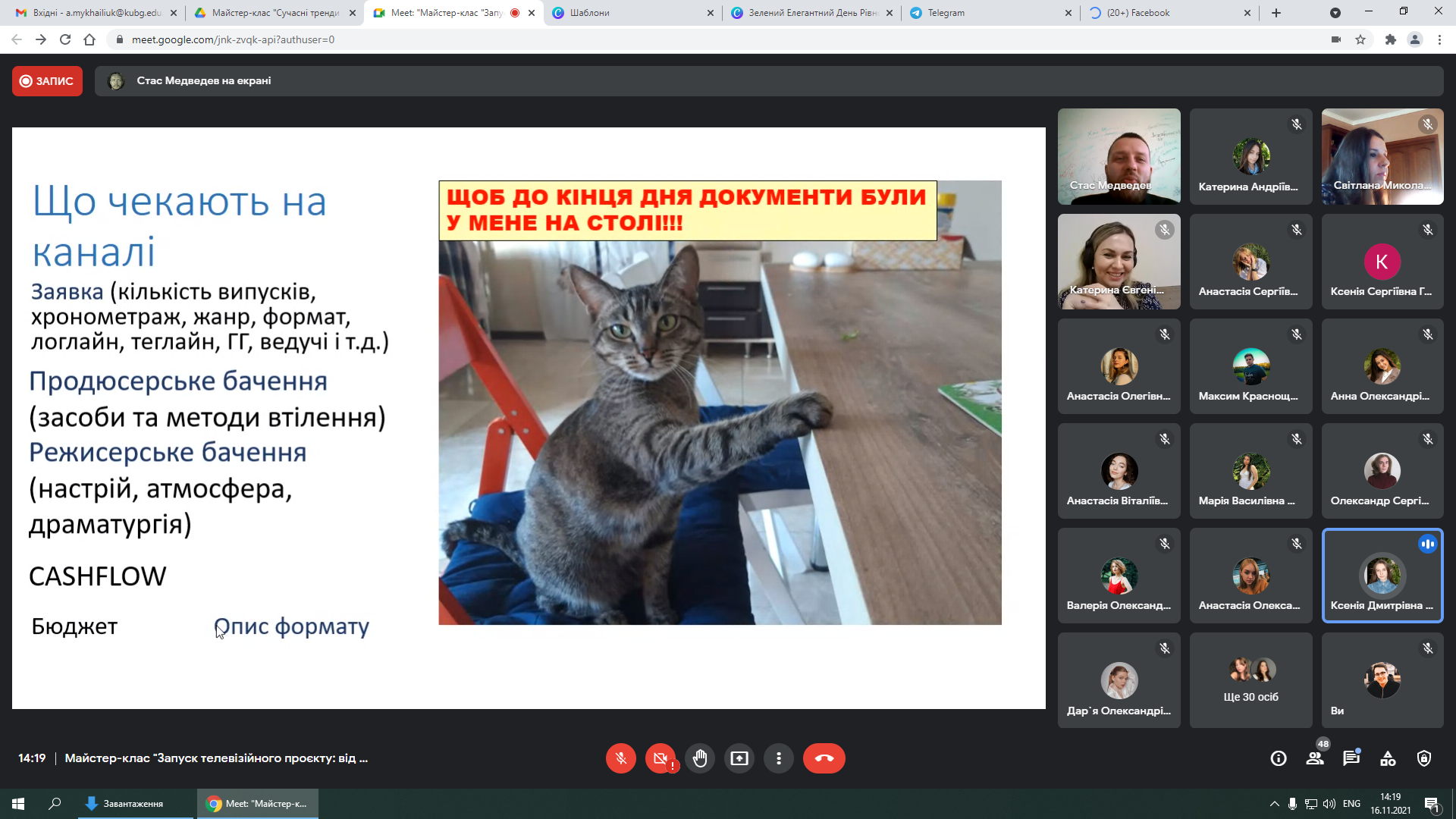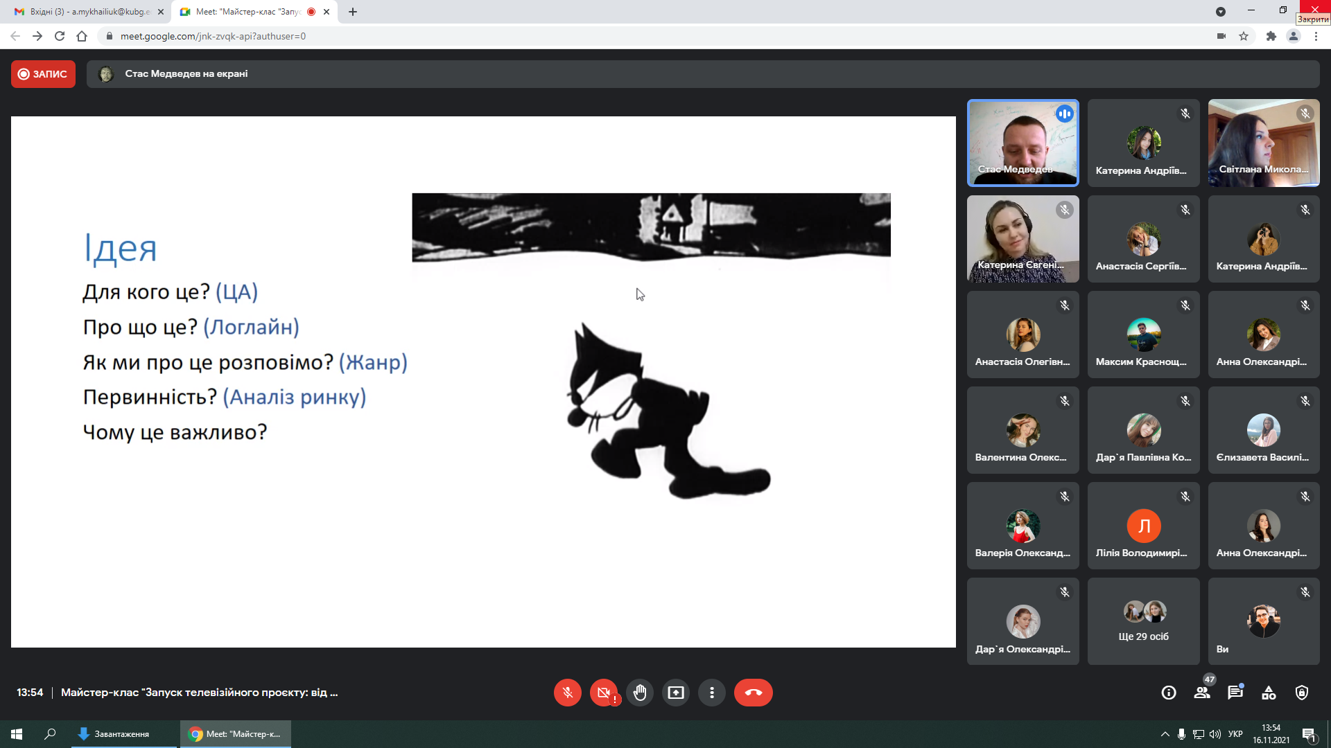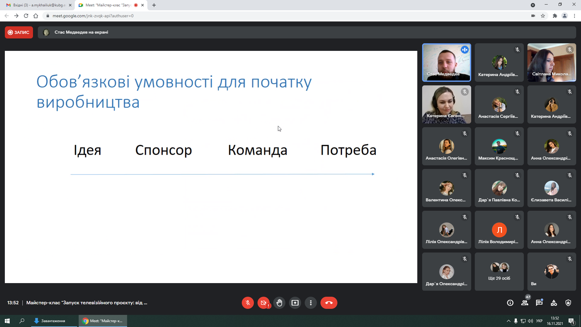 16 листопада 2021 р. відбувся майстер-клас на тему “Запуск телевізійного проєкту: від задуму до реалізації”. Його провів виконавчий продюсер розважального напряму, “UA” Суспільне медіа – Станіслав Мєдвєдєв